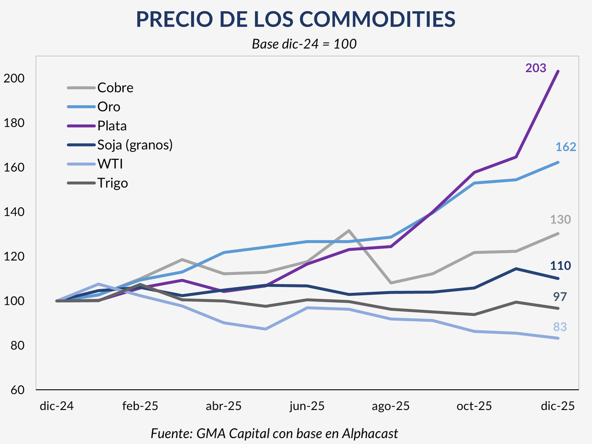 El balance del año en commodities fue dispar, el petróleo terminó como el gran perdedor, con una caída del 17%, presionado por una expansión de la oferta y una demanda debilitada por la desaceleración global. Los granos mostraron mayor estabilidad: la soja cerró 10% por encima de diciembre de 2024, mientras que el trigo retrocedió 3%.