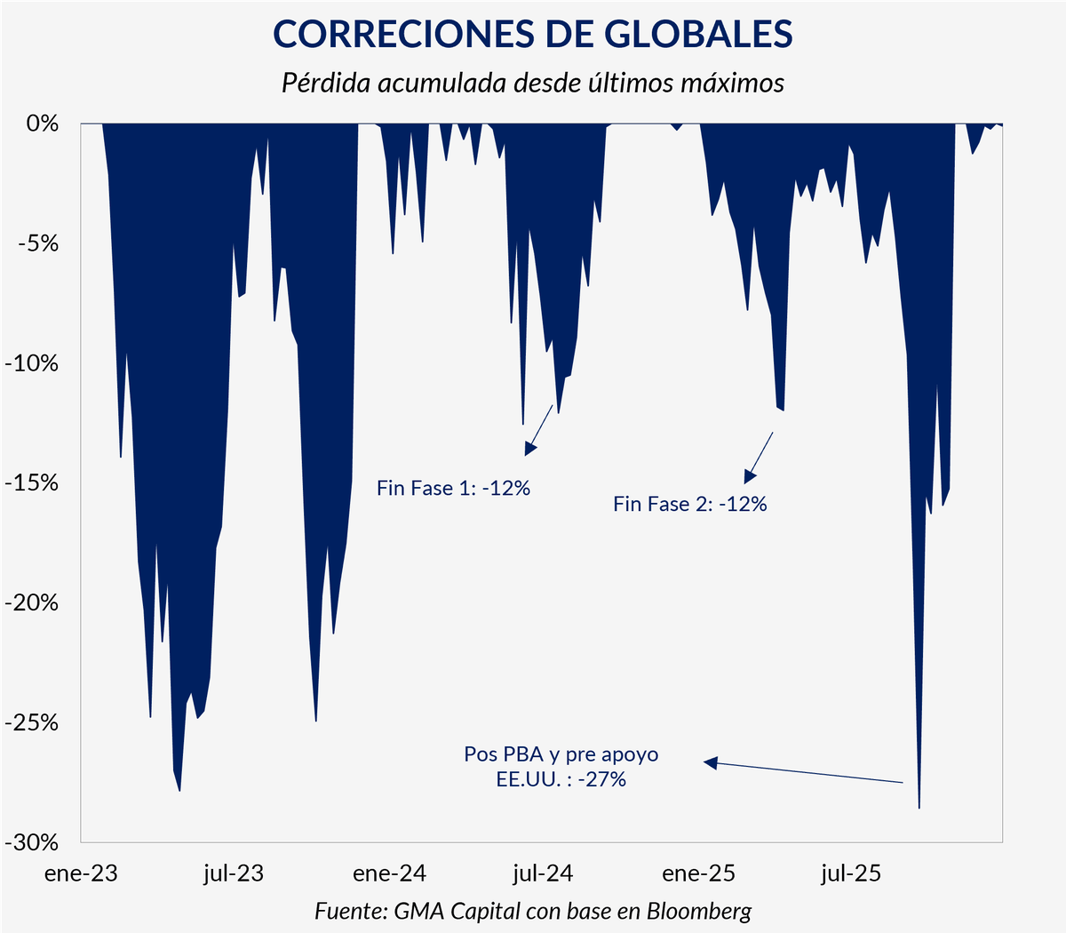 La magnitud del ajuste fue mayor a la observada en otras correcciones del actual gobierno, en parte porque las paridades ya se ubicaban por encima del 70%, dejando margen para una baja más profunda. Mirando hacia adelante, con un riesgo país en torno a los 570 puntos, el potencial alcista luce más acotado que al inicio del año.