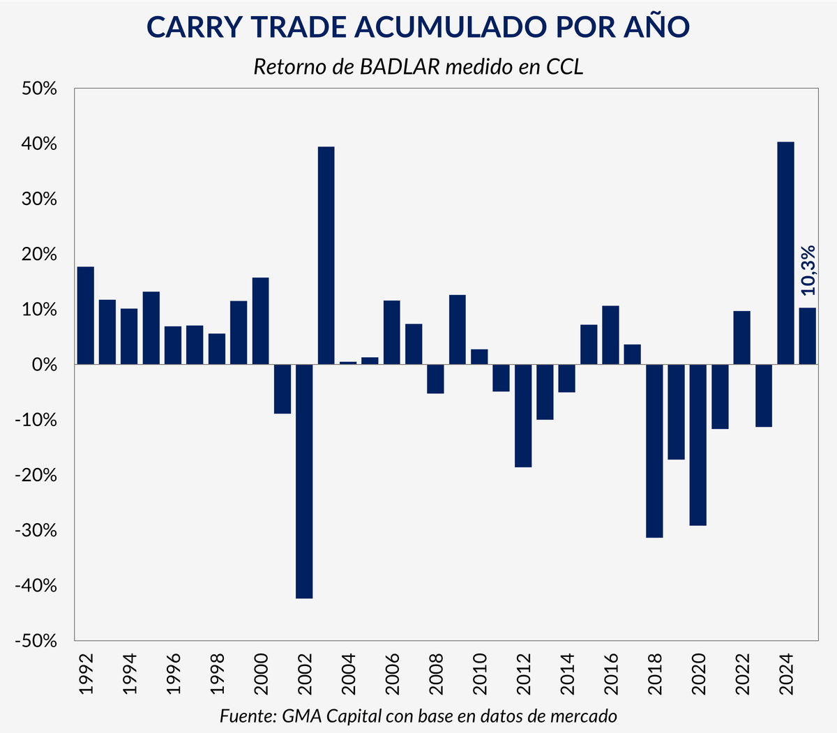 El resultado fue contundente. El carry trade con tasas cortas dejó en 2025 un retorno total del 10,3% en dólares CCL. No fue la renta excepcional del 2024, cuando la normalización macro permitió ganancias cercanas al 40%, pero sí tuvo un valor simbólico relevante: la estrategia no encadenaba dos años positivos consecutivos desde el bienio 2016-2017.
