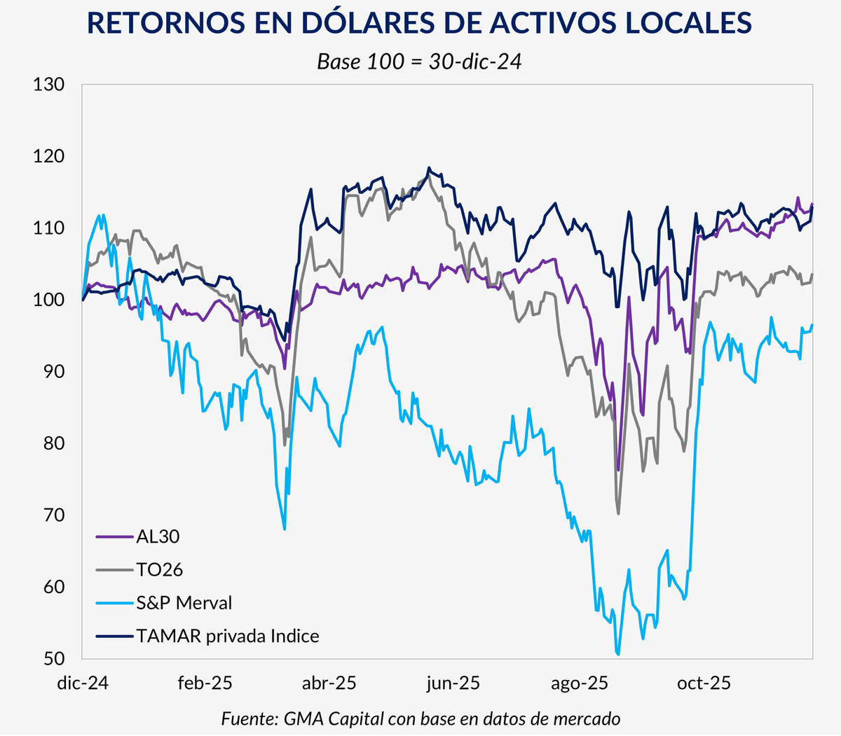 Sin embargo, la foto de cierre es engañosa. Durante el año, el equity argentino llegó a mostrar pérdidas cercanas al 50% tras la elección en la Provincia de Buenos Aires, mientras que bonos como el AL30 estuvieron 20% abajo antes de recuperar terreno. Algo similar ocurrió con los bonos largos en pesos: el TO26 pasó de rendir 30% TNA a tocar 65%, con una pérdida cercana al 30% en moneda dura en el proceso.