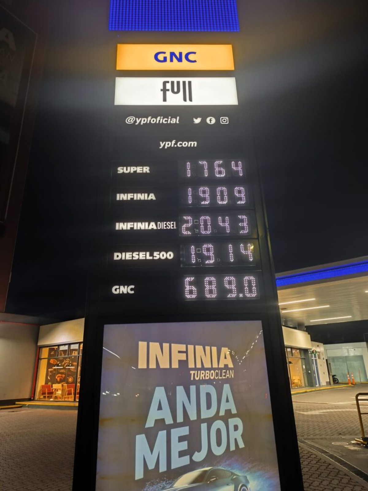 En Rosario, la nafta Súper en una estación YPF figuraba a $1.764 el litro, mientras que Infinia se ofrecía a $1.909. En diésel, Infinia Diesel marcaba $2.043 y Diesel 500 $1.914. El GNC aparecía a $689.