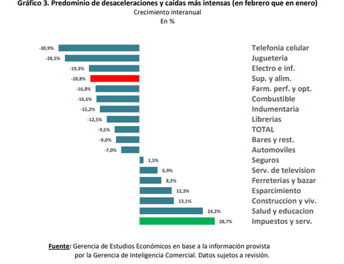 El último reporte señala que el consumo "nuevamente se vio resentido", consolidando una tendencia negativa que ya se había registrado en enero, cuando la baja había sido del 7,6% interanual.