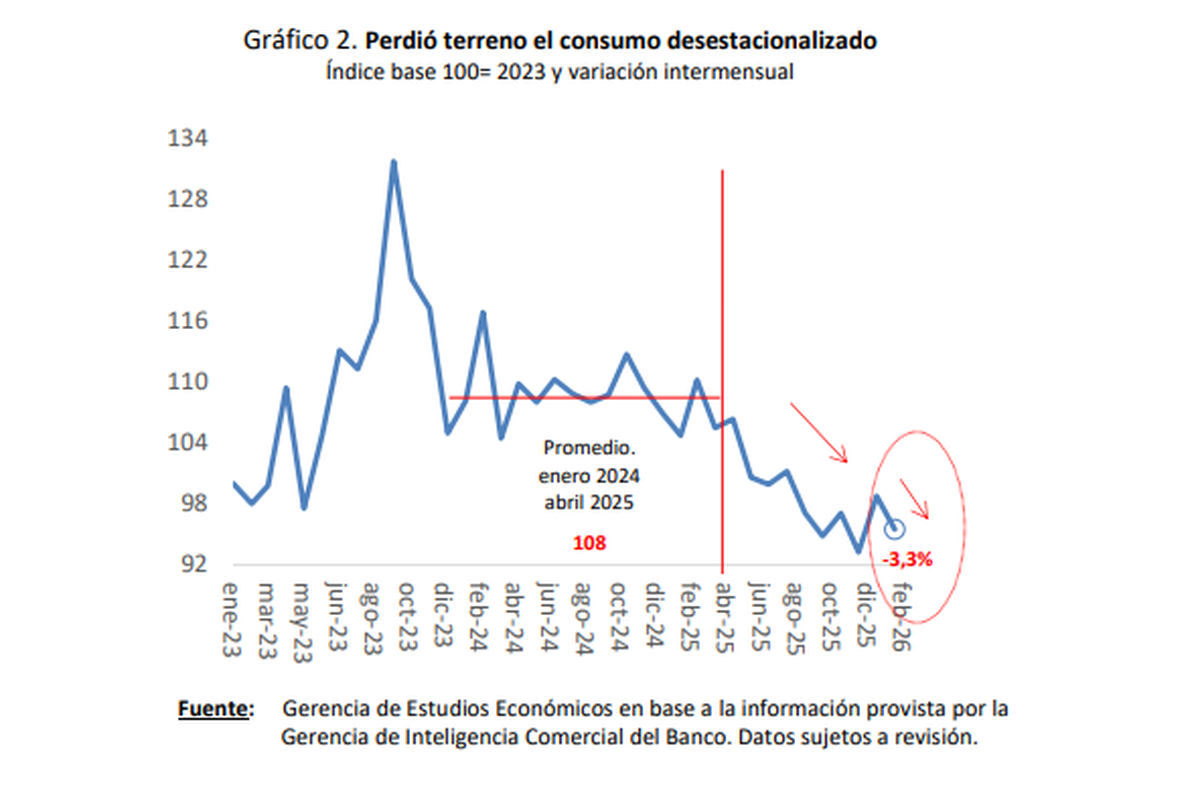 En términos desestacionalizados, el consumo también mostró un retroceso significativo: Según el informe del Bapro, "la contracción mensual totalizó -3,3%, revirtiendo el rumbo alcista delineado por la recuperación de más de 5% en enero".
