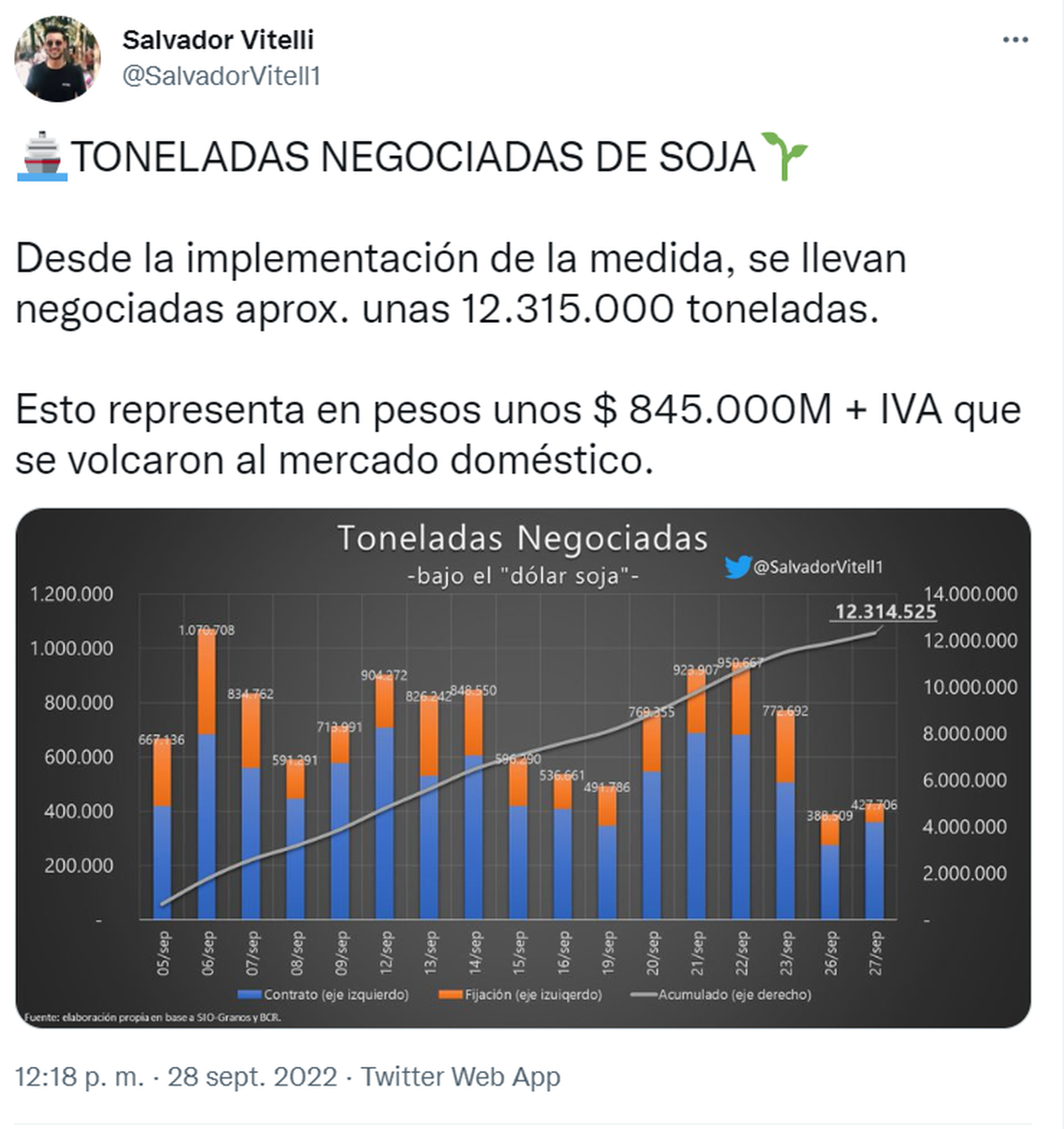 "El BCRA cerró agosto con una posición vendida de dólar futuro por u$s 4110 millones. Si bien cayó u$s 3000 millones respecto a julio, en agosto de 2021 su posiciones era neutra. Desde una perspectiva más amplia, destacamos que la exposición del sector público a la evolución al dólar mayorista se encuentra en máximos de la historia reciente", dijo para una nota del periodista Julián Yosovitch.