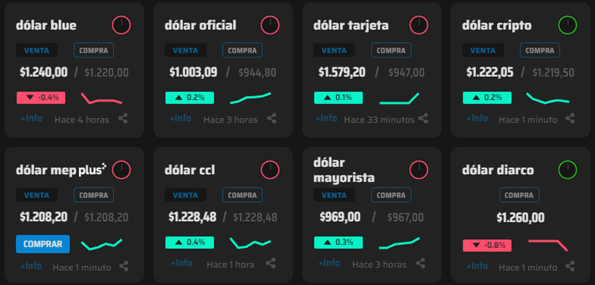 El dólar blue cerró este miércoles a $1.240 en las cuevas de la City Porteña, mientras que en el segmento bursátil el contado con liquidación (CCL) se negoció a $1.228,48 y el dólar MEP se ubicó en $1.208,2. Estas fluctuaciones reflejan la poca volatilidad que está afectando al mercado cambiario en las últimas semanas.