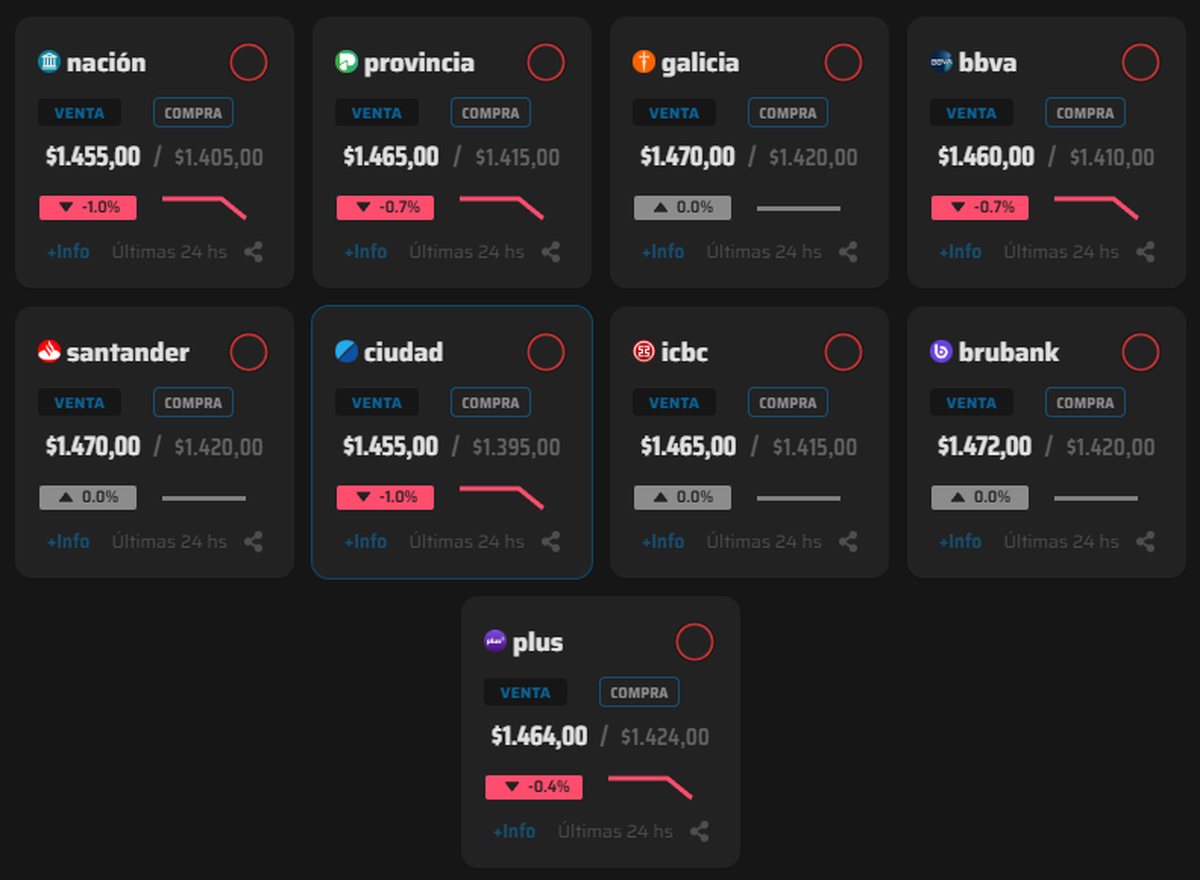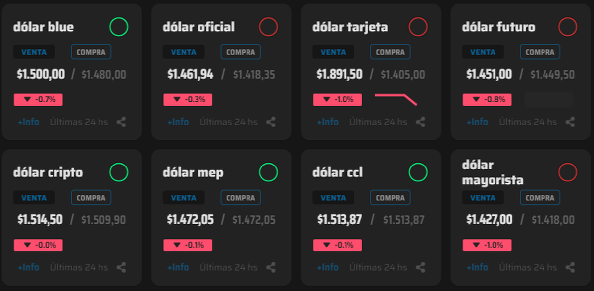En los mercados paralelos, el movimiento fue más acotado, aunque alineado con la tendencia general. El dólar blue se mantuvo estable en $1.500, mientras que el MEP cedió a $1.472 y el contado con liquidación retrocedió hasta $1.514, reflejando un menor apetito por cobertura cambiaria en un contexto de tasas altas en pesos.