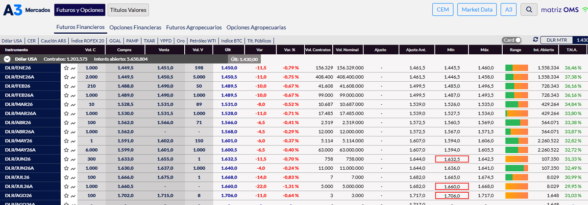 Los contratos de dólar futuro también acompañaron la corrección. El mercado comenzó a validar precios más bajos en toda la curva: enero cerró en $1.448, febrero en $1.487 y marzo en $1.528, señales de que los operadores descuentan un esquema cambiario más ordenado al menos en el arranque del año.