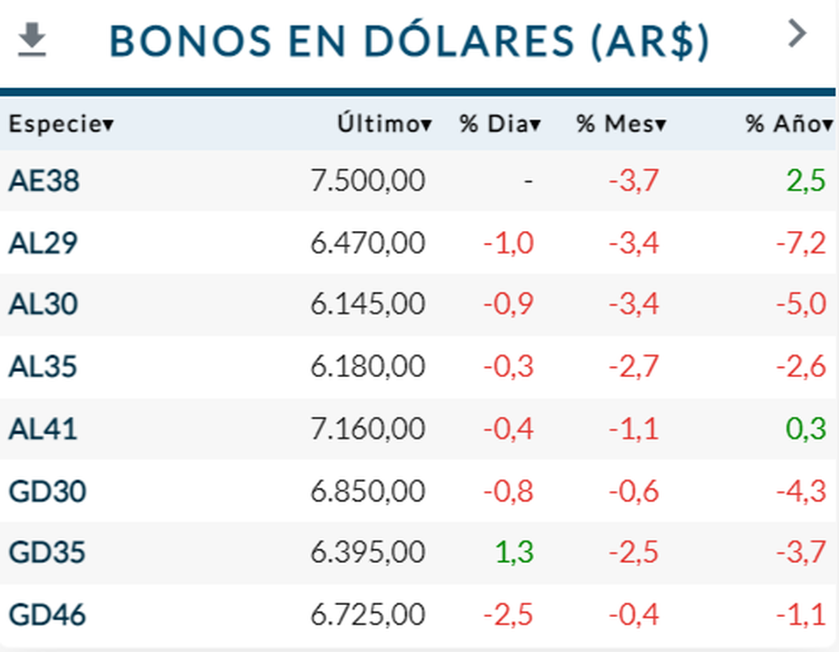 A su vez, casi la totalidad de los bonos en dólares se tiñen de rojo: