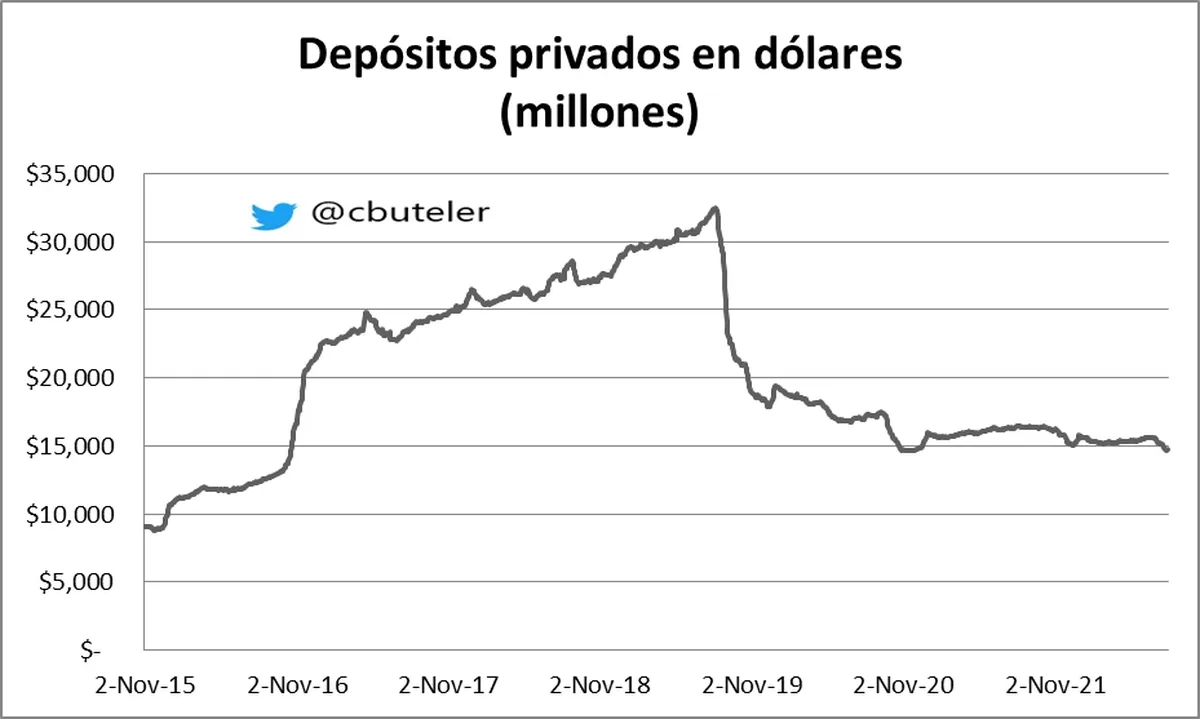 Al 2 de agosto, según el analista financiero, Christian Buteler, el monto de los depósitos en dólares se ubica en torno a los US$ 14.759 millones, unos US$ 732 millones menos que hace 1 mes: