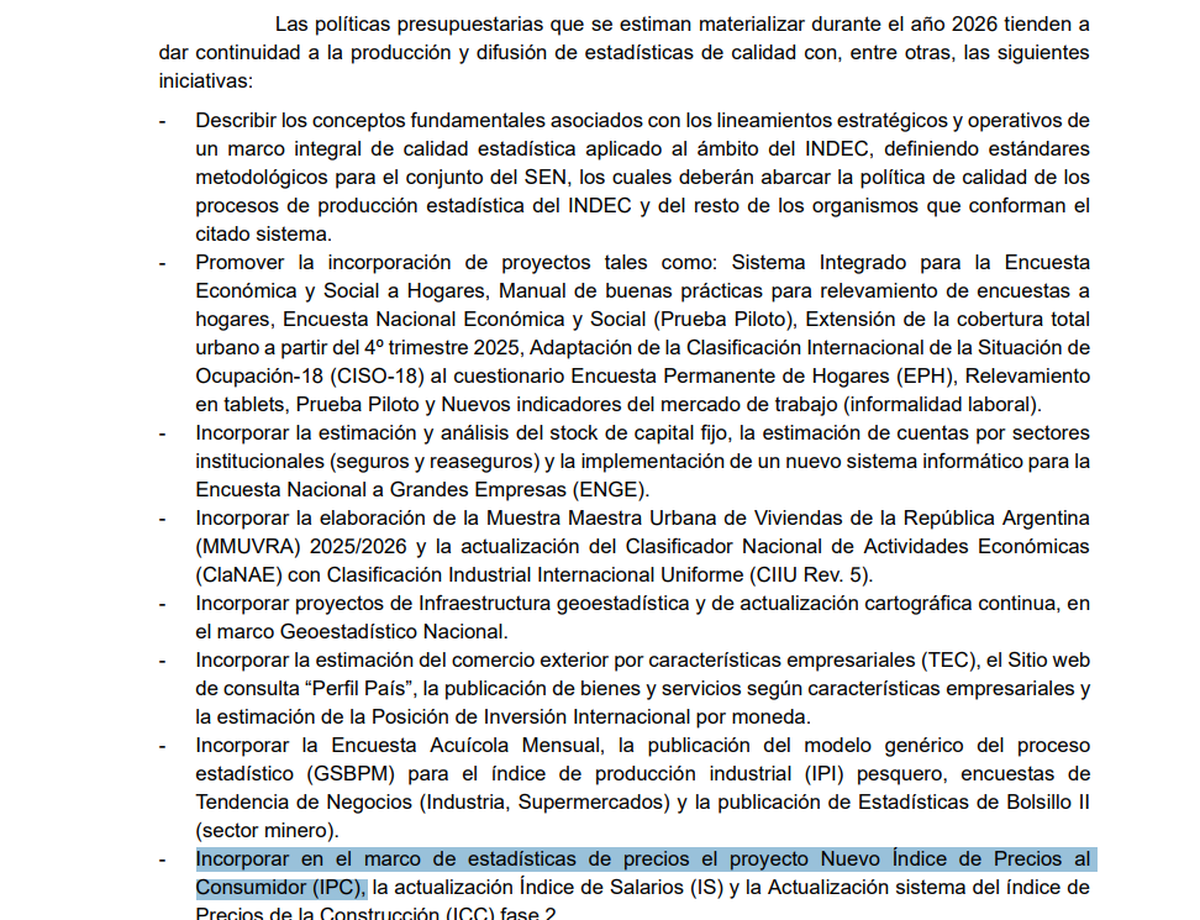 Y agrega que las políticas presupuestarias que se estimaban materializar durante 2026 "tienden a dar continuidad a la producción y difusión de estadísticas de calidad con, entre otras, las siguientes iniciativas". Entre ellas, detalla: “Incorporar en el marco de estadísticas de precios el proyecto Nuevo Índice de Precios al Consumidor (IPC), la actualización Índice de Salarios (IS) y la Actualización sistema del índice de Precios de la Construcción (ICC) fase 2”.