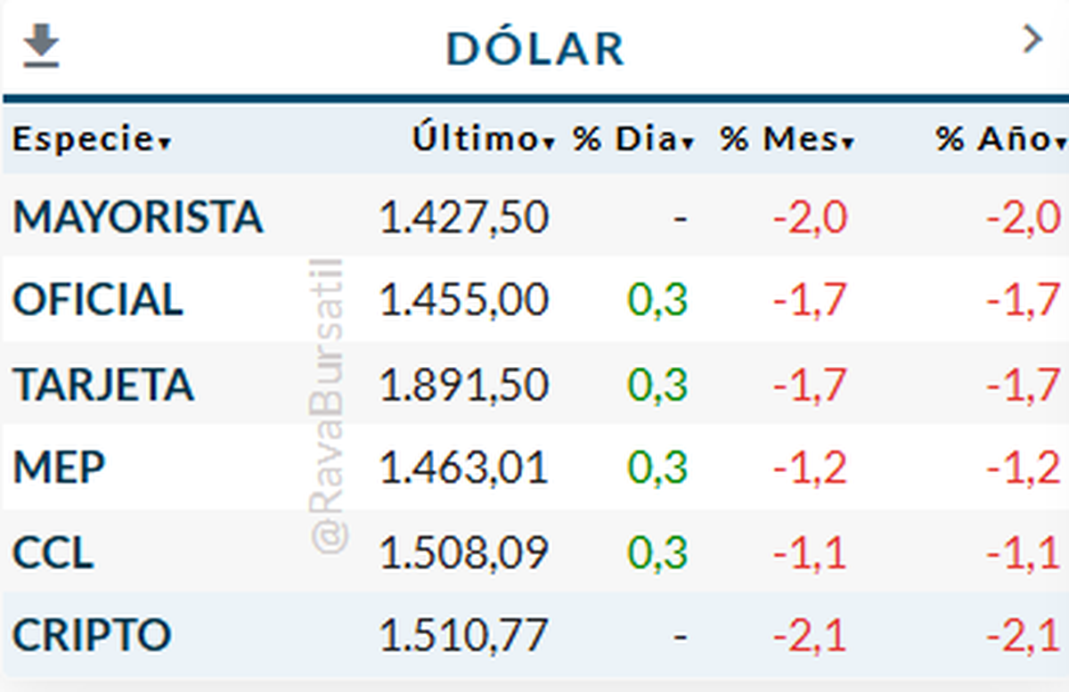 En el mercado cambiario, el dólar no profundiza su corrección y todas las cotizaciones operan alza. El mayorista sube hasta $1.427,50, con un retroceso mensual del 2%, mientras que el oficial se ubica en $1.455, con una baja del 1,7% en el mes.
