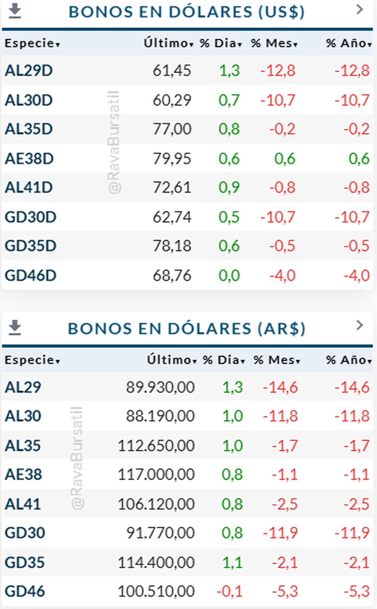 En el detalle de la curva, los bonos globales y bonares operan con mayoría de subas, con avances encabezados por el AL29D, que gana 1,3%, seguido por el AL30D con 0,7%, el AL35D con 0,8% y el AE38D, que suma 0,6%. En tanto, el GD30D avanza 0,5%, mientras que el GD35D mejora 0,6%, confirmando una demanda sostenida en los tramos medios de la curva hard dollar.