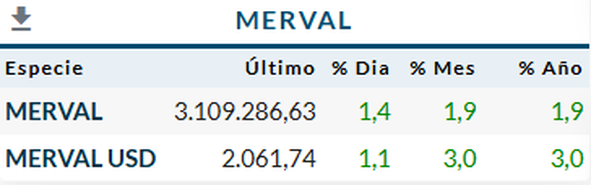 En la renta variable, el S&P Merval acelera y se ubica en 3.109.286 puntos, con una suba diaria de 1,4%, mientras que medido en dólares el índice alcanza los 2.061 puntos, con una mejora del 1,1%, consolidando un avance mensual del 3% en moneda dura.