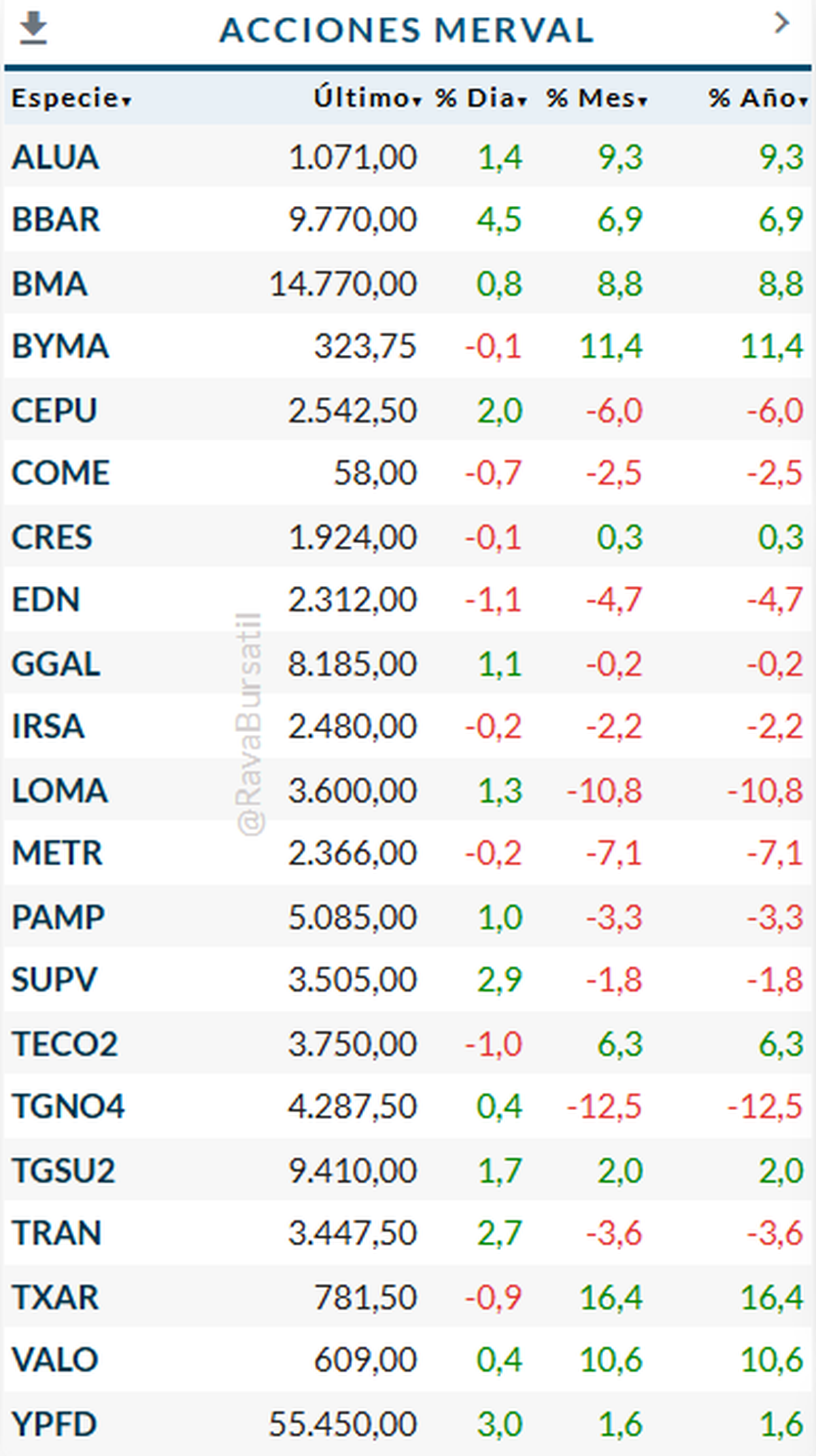 Dentro del panel líder, las mayores subas están encabezadas por YPF, que trepa 3%, seguida por Transportadora de Gas del Norte, con un avance de 2,7%, Loma Negra, que suma 1,3%, y Banco BBVA, que gana 4,5%. También se destacan Galicia, con una mejora del 1,1%, y Pampa Energía, que avanza 1%.