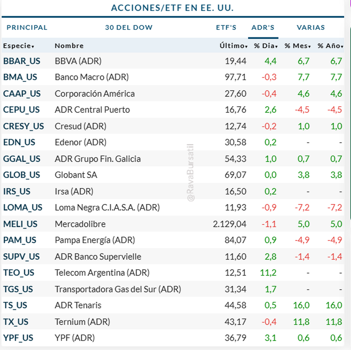 Entre las bajas, aparecen Mercado Libre, que retrocede 1,1%, Loma Negra, con una caída de 0,9%, y Corporación América, que cede 0,4%, en un balance general claramente favorable para los activos argentinos.