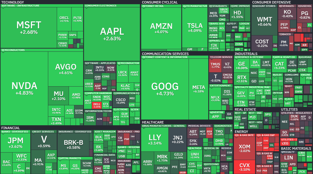 El disparador externo estuvo del lado de Wall Street, donde predominó el verde casi en todos los sectores vinculados al crecimiento. En tecnología se destacaban Nvidia con 4,83%, Google con 4,73%, Broadcom con 4,61%, Amazon con 4,07%, Tesla con 4,09%, Apple con 2,63% y Microsoft con 2,68%. También aparecieron subas fuertes en industriales como Caterpillar con 5,23% y en financieros como JP Morgan con 3,62%.