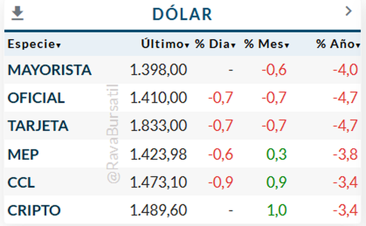 A la mejora de las acciones y los bonos se sumó otro factor que el mercado sigue de cerca. Los dólares financieros operaban con bajas, una dinámica que alivió presión y favoreció la valuación en moneda dura de los activos argentinos. El MEP retrocedía 0,6% hasta $1.423,98, mientras que el CCL caía 0,9% hasta $1.473,10. También aflojaban el oficial y el tarjeta, ambos con descensos de 0,7%.