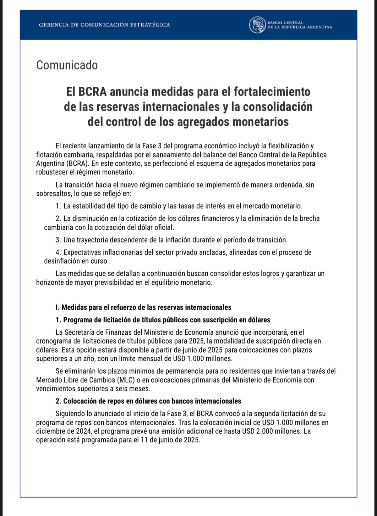 Con el objetivo de cumplir con las exigencias del Fondo Monetario Internacional (FMI) de cara a la revisión de julio, el Banco Central de la República Argentina (BCRA) lanzó un nuevo paquete de medidas orientadas a consolidar el régimen de control de los agregados monetarios, robustecer las reservas internacionales y contener la inflación en un contexto de estabilización cambiaria.