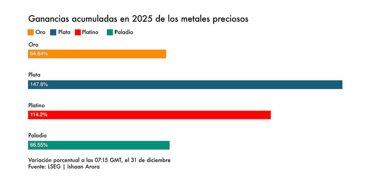 Aunque el oro fue la estrella, no estuvo solo. La plata, el platino y el paladio también protagonizaron subas impactantes. En particular, la plata sorprendió con un salto superior al 150%, marcando su mejor desempeño desde 1979 y superando ampliamente los máximos históricos previos.