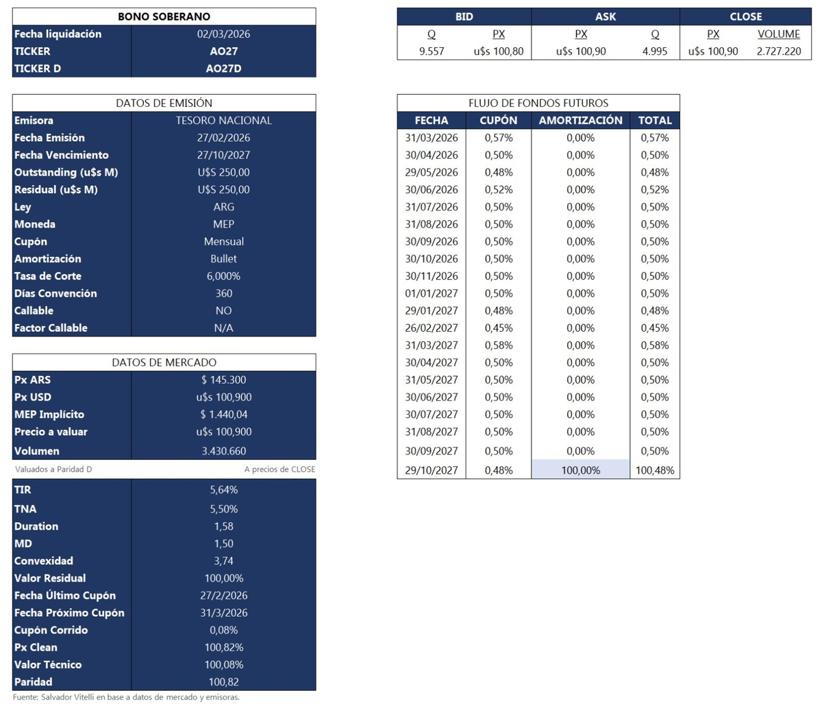 El rendimiento del AO27 quedó similar al de corporativos ley local AAA con vencimiento cercano a octubre de 2027, en el rango de 5,5% a 5,8% TEA, una equivalencia difícil de justificar por riesgo de emisor, aun contemplando que la liquidez del AO27 debería mejorar cuando se complete el programa de emisión.
