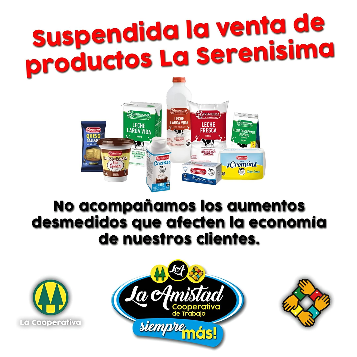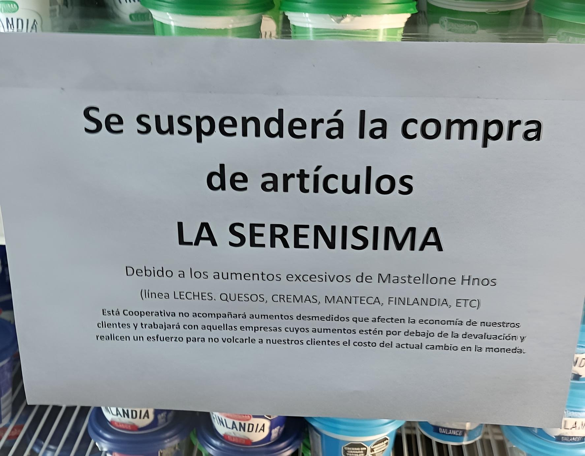 "Se suspenderá la compra de artículos LA SERENÍSIMA debido a los aumentos excesivos de Mastellone Hnos (línea LECHES. QUESOS, CREMAS, MANTECA, FINLANDIA, ETC)", expresaron desde la cooperativas en carteles ubicados en las góndolas del supermercado La Amistad. "Esta Cooperativa no acompañará aumentos desmedidos que afecten la economía de nuestros clientes y trabajará con aquellas empresas cuyos aumentos estén por debajo de la devaluación y realicen un esfuerzo para no volcarle a nuestros clientes el costo del actual cambio en la moneda", se lee.