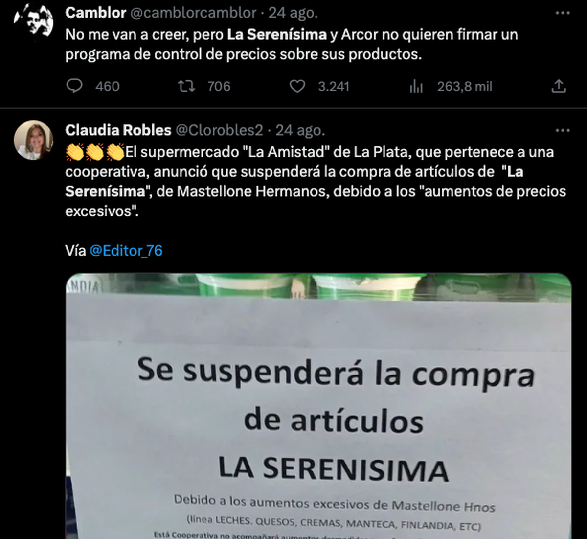 En los últimos días, la noticia la dio una cooperativa platense llamada La Amistad por un cartel en sus heladeras advirtiendo a los clientes que no se repondrán productos de la marca hasta que retrotraigan precios. "Hay pequeños productores que han mantenido los precios previos a la devaluación, y La Serenisima nos mandó aumentos hasta de 60%", denunció Santiago Brito, asociado del supermercado, en diálogo para Radio 10.