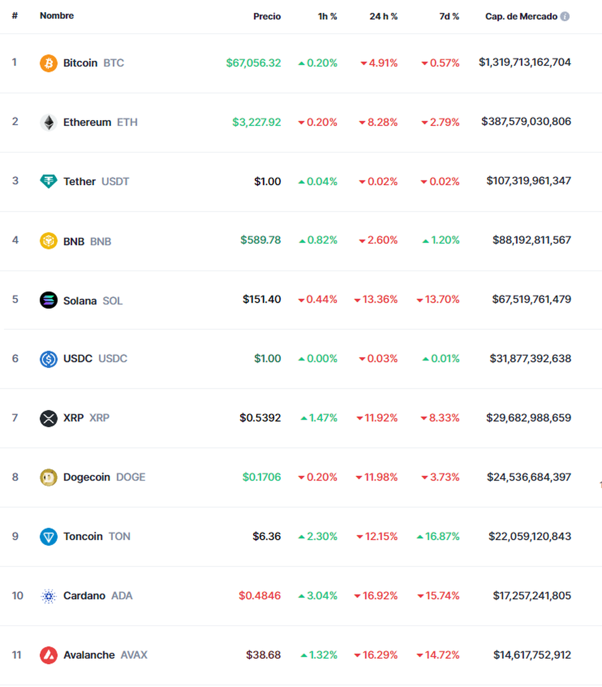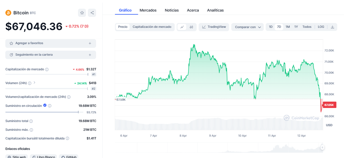 Al momento de redactar este artículo, bitcoin logra rebotar algo situándose en torno a los US$ 67.000.