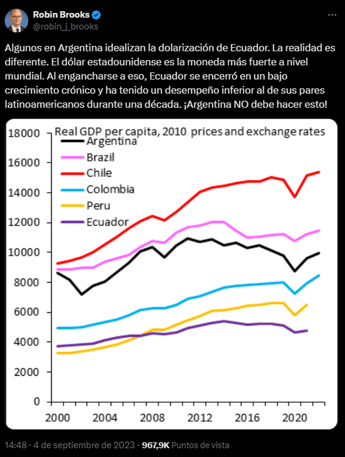 Como ejemplo, menciona a Ecuador, que dolarizó su economía en 2000 y desde entonces ha tenido un desempeño económico inferior al de otros países latinoamericanos como Chile, Brasil, Colombia, Perú e incluso Argentina.
