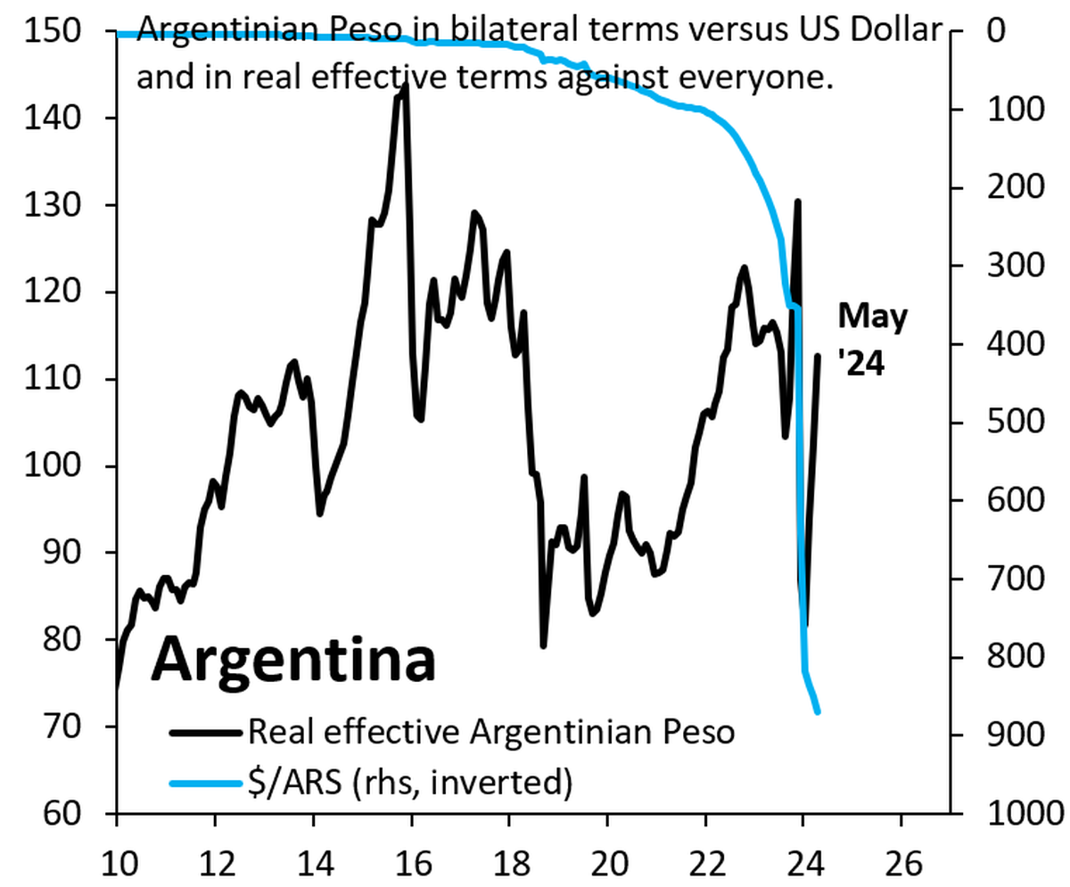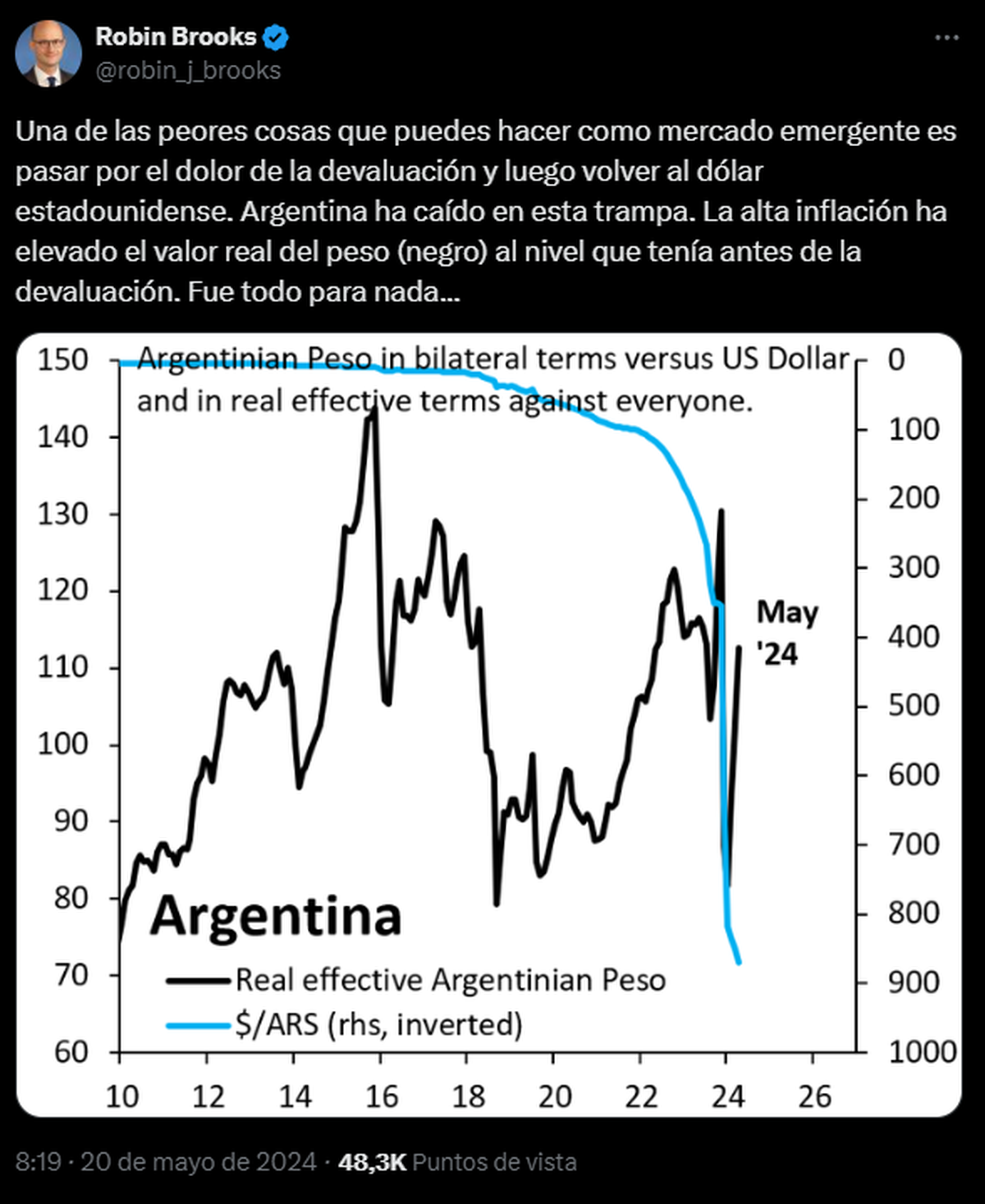 "Una de las peores cosas que puedes hacer como mercado emergente es pasar por el dolor de la devaluación y luego volver al dólar estadounidense. Argentina ha caído en esta trampa. La alta inflación ha elevado el valor real del peso (negro) al nivel que tenía antes de la devaluación."