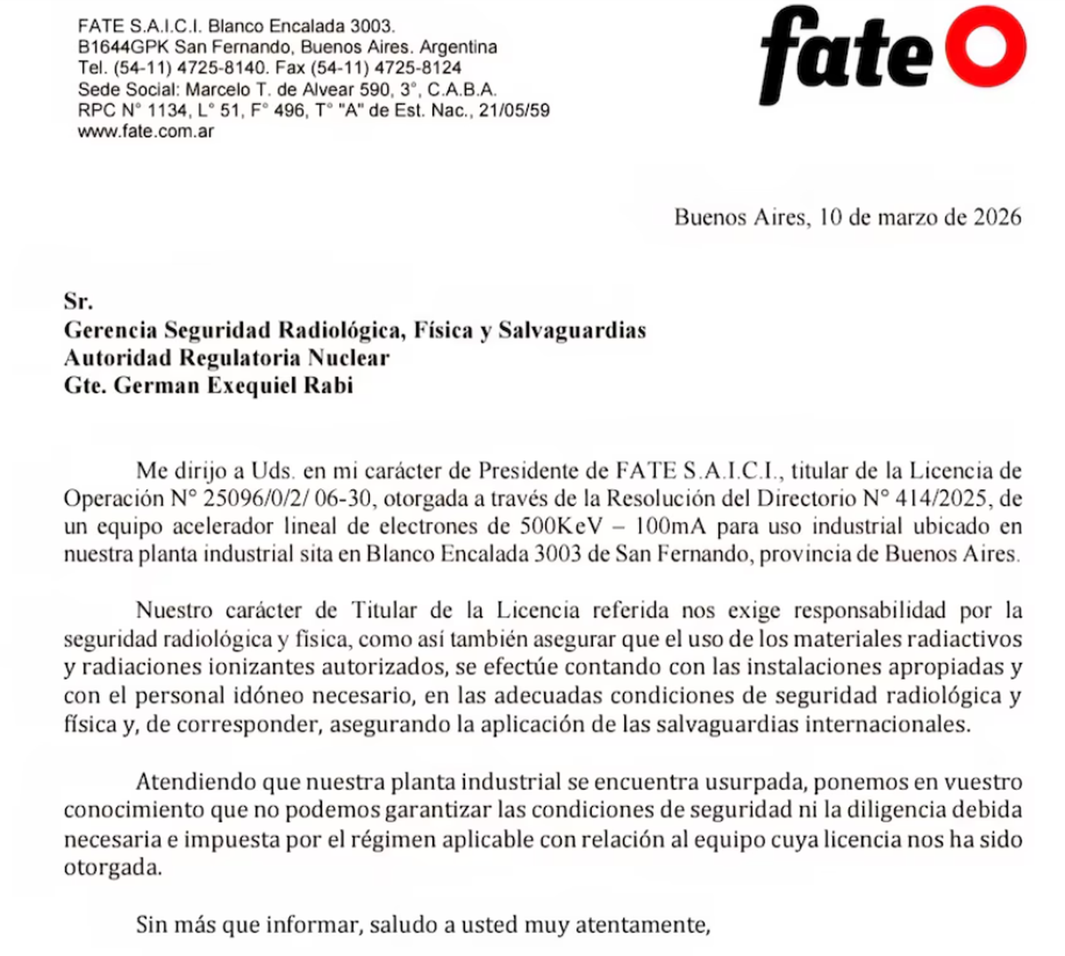Si bien el presidente de Fate reconoce que, como licenciatarios, son responsables de “la seguridad radiológica y física”, y del “uso de los materiales radiactivos y radiaciones ionizantes autorizados”, aseguraron que esto no sería posible porque la “planta industrial se encuentra usurpada”.