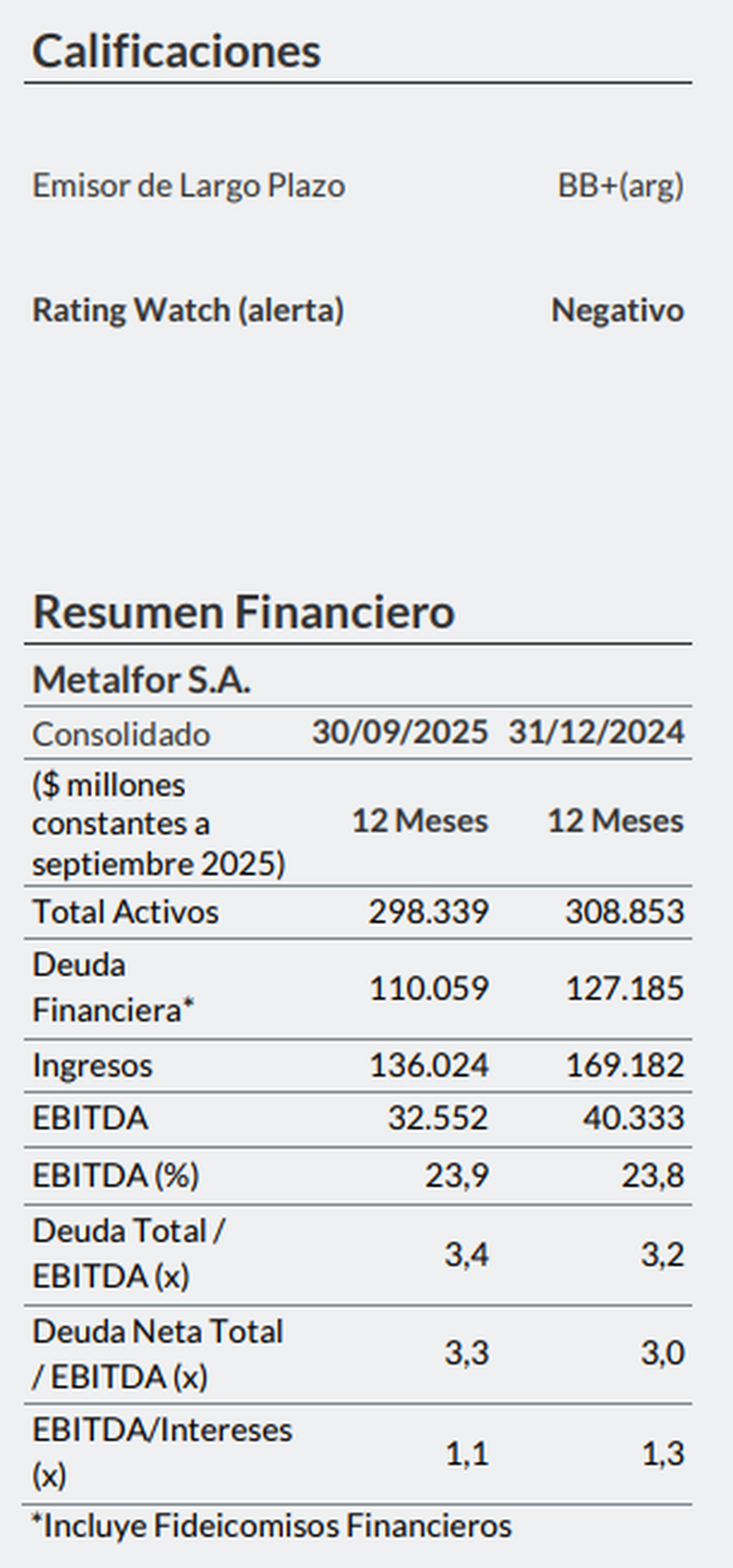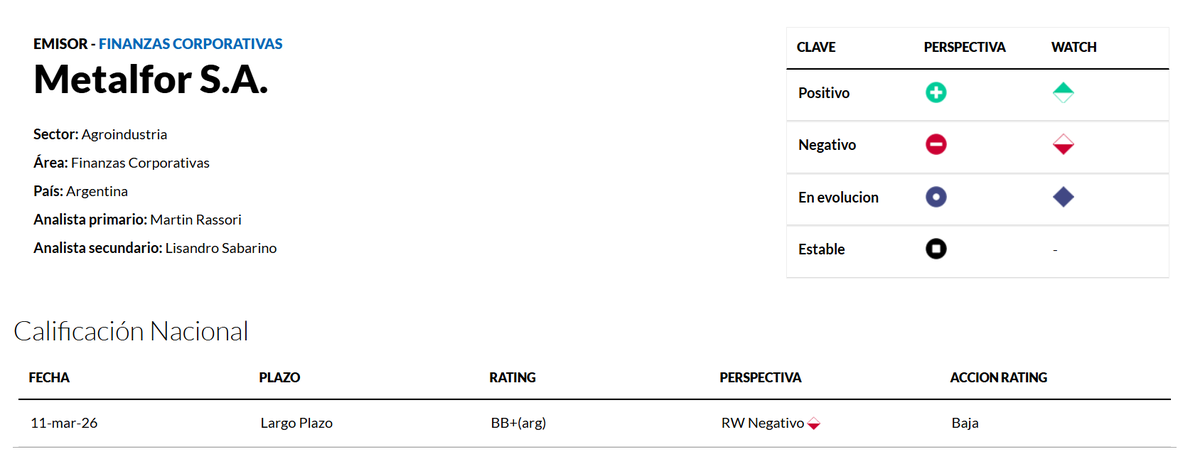 La asignación de Rating Watch Negativo implica que la nota podría volver a bajar si las herramientas que hoy está intentando activar la compañía no alcanzan para cubrir los vencimientos inmediatos o si la generación de fondos continúa deteriorándose. FIX dejó planteado con claridad que la resolución de esa alerta dependerá, en buena medida, de que Metalfor logre monetizar ventas esperadas por US$33 millones durante marzo, de las cuales US$20 millones serían en efectivo, y también de que consiga renovar líneas bancarias para afrontar los próximos compromisos sin sobresaltos.