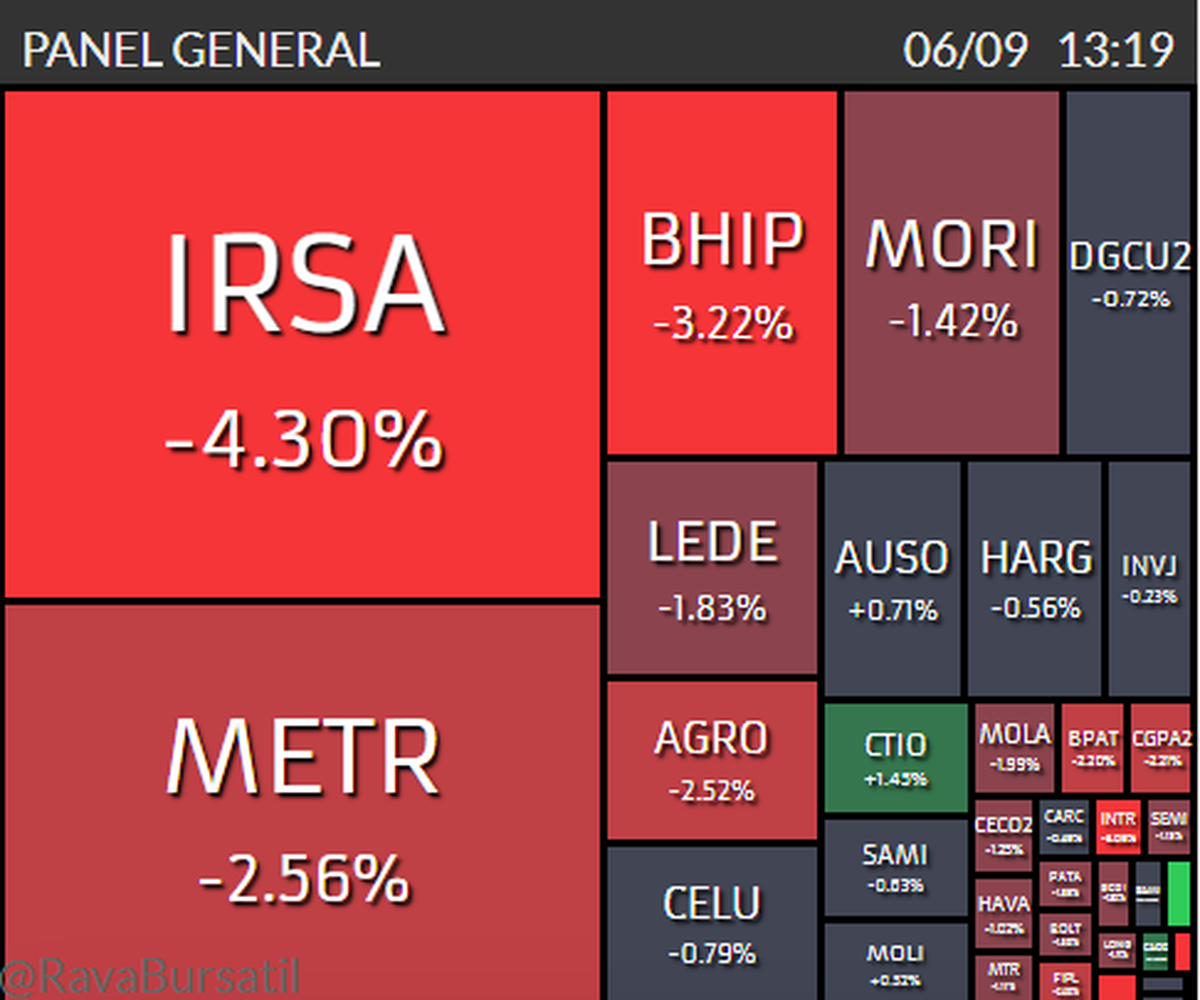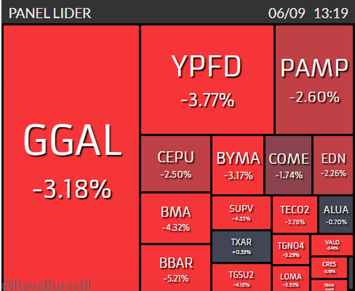 Este viernes 6 de septiembre, el índice S&P Merval registra una nueva -y fuerte- disminución tanto en pesos como en dólares. Por su parte, los bonos en dólares también presentan caídas considerables, al igual que los principales dólares financieros -dólar MEP (o bolsa) y CCL (Contado Con Liquidación)- que caen.