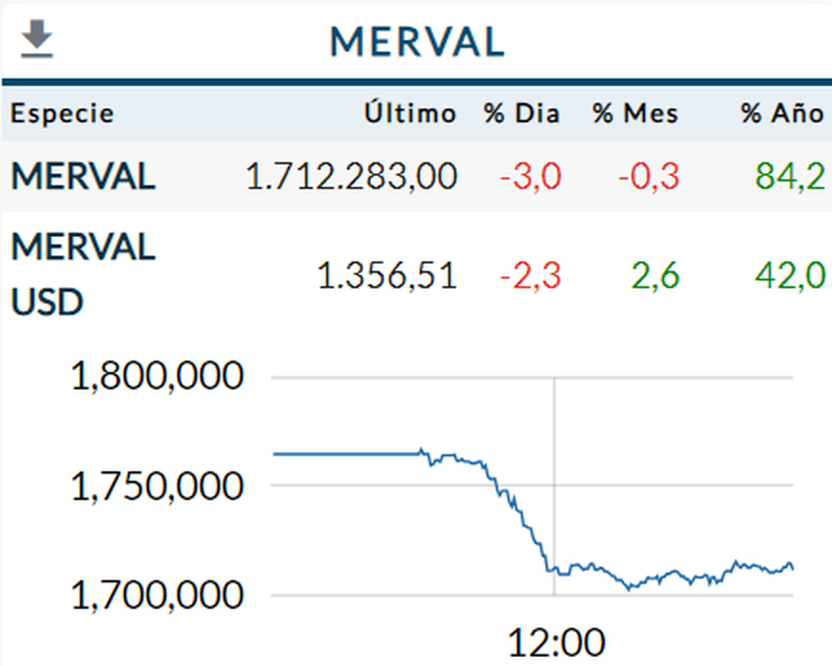En este sentido, el principal índice porteño registra una caída del 3% a 1.712.283,00 puntos, mientras que, en dólares, cae un 2,3% a US$ 1.356,51.