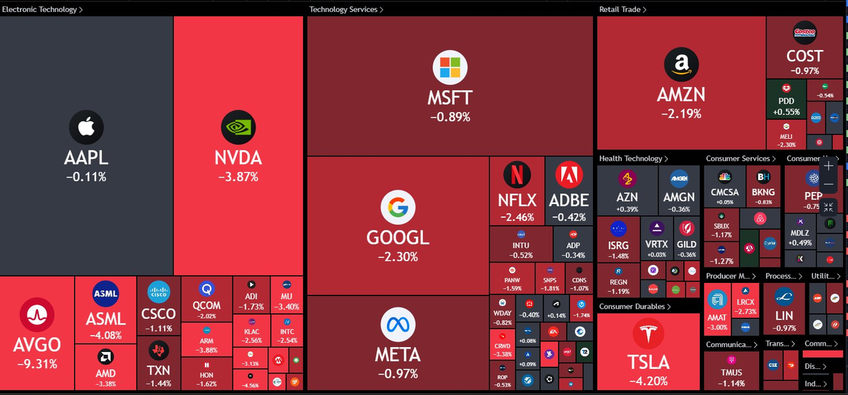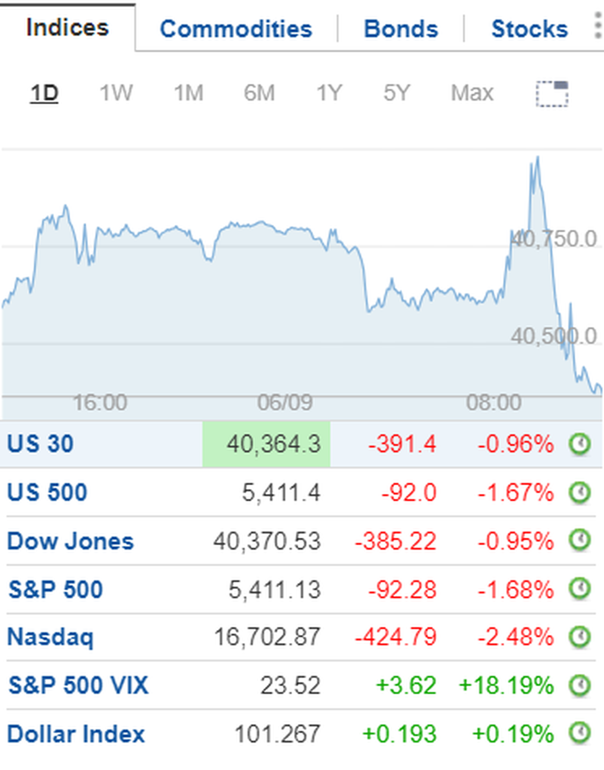 En Estados Unidos, los principales índices llegan a caer hasta un 2,48%. El S&P 500 retrocede un 1,68%, el Nasdaq (compuesto por empresas tecnológicas) baja un 2,48%, mientras que el Dow Jones es el que "menos sufre" y cae un 0,95%.
