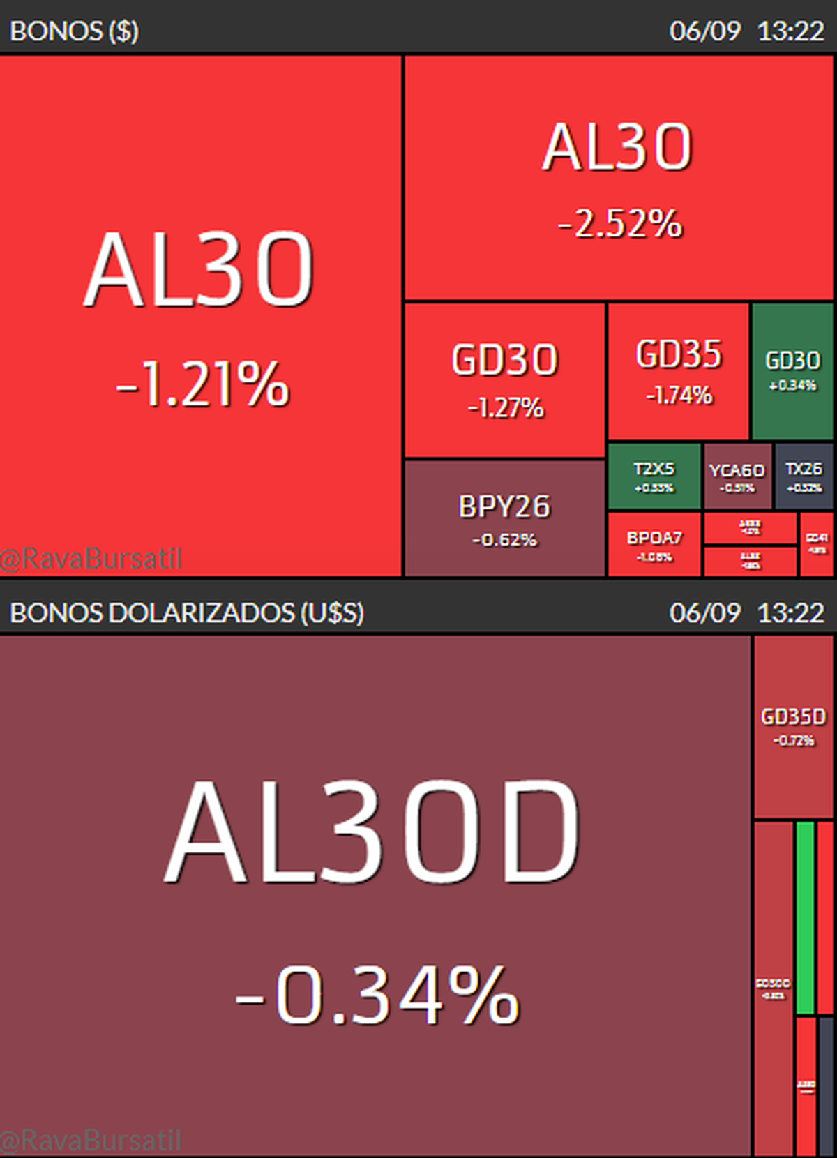 Los bonos en dólares son los que más sufren en la jornada, llegando a presenciar caídas, como las del AL30, de hasta el 2,52%.