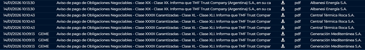En enero de 2026 comenzaron a aparecer avisos de pago de intereses correspondientes a distintas clases de obligaciones negociables de Albanesi, Gemsa y Central Térmica Roca, canalizados a través del fiduciario TMF Trust Company.