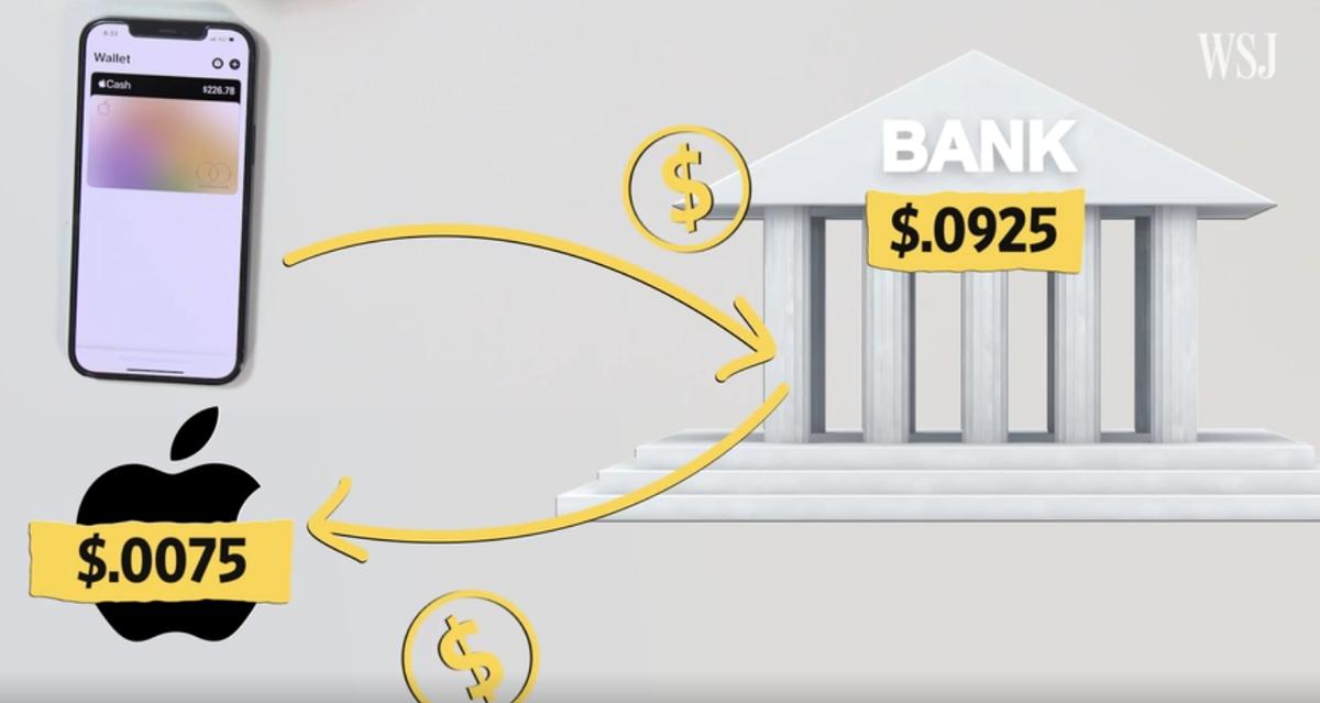 Si uno compra un café de, supongamos, US$ 5 y la tarjeta de crédito tiene una tarifa de intercambio del 2%, el banco obtiene cerca de 10 centavos de dólar. Pero, si se paga con Apple Pay, el banco tiene que pagar tres cuartos de centavo a Apple en su lugar. El banco ahora, en vez de llevarse los 10 centavos de la transacción de US$ 5, ahora se quedaría con poco más de 9 centavos.