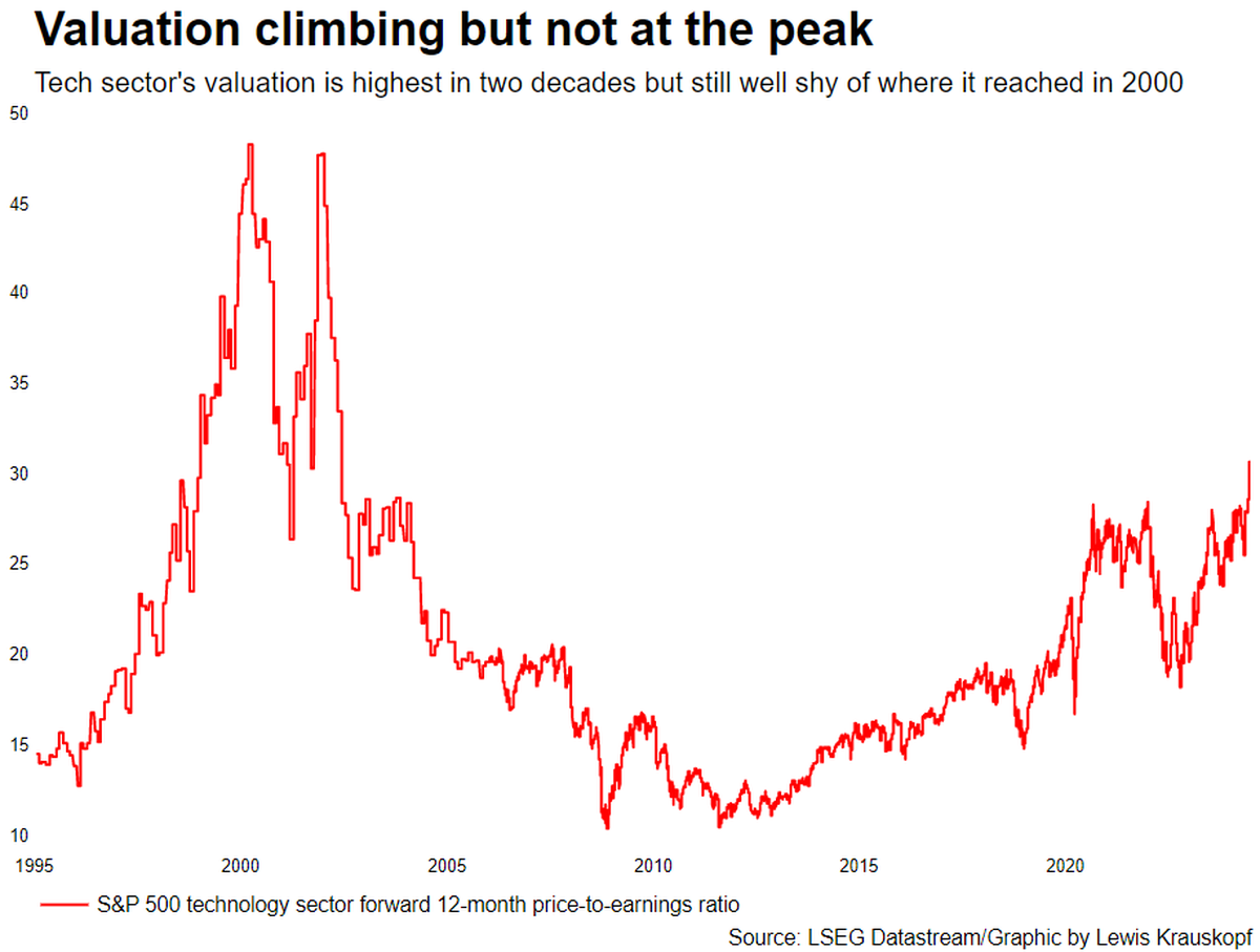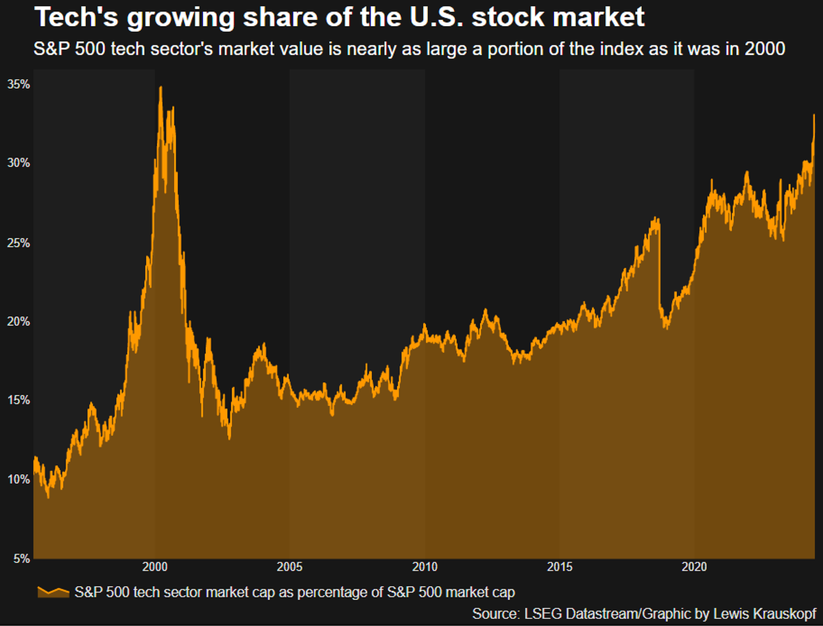 Siguiendo el ejemplo del boom de las .com, el sector de tecnología de la información ha aumentado hasta el 32% del valor de mercado total del S&P 500, el porcentaje más alto desde el año 2000, cuando subió a casi el 35%. Solo tres empresas, Microsoft, Apple y Nvidia, representan más del 20% del índice.