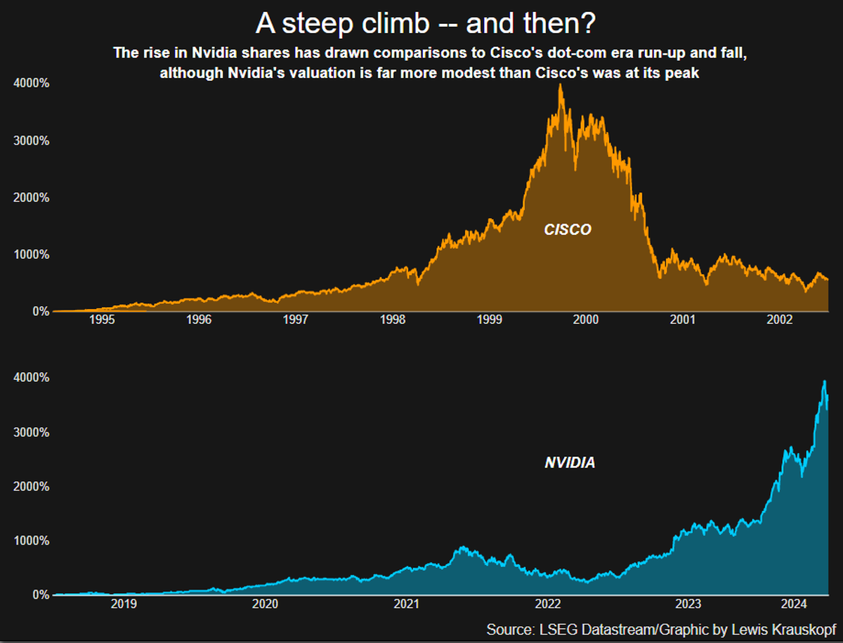 Aunque diversas métricas indican que las valoraciones de las acciones y la exuberancia de los inversores no han alcanzado los niveles de principios de siglo, las similitudes son evidentes. Un pequeño grupo de acciones tecnológicas dominantes, como el fabricante de chips Nvidia, simboliza el mercado actual, recordando a los "Cuatro Jinetes" de finales de los años 90: Cisco, Dell, Microsoft e Intel.