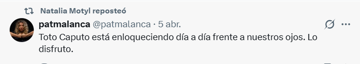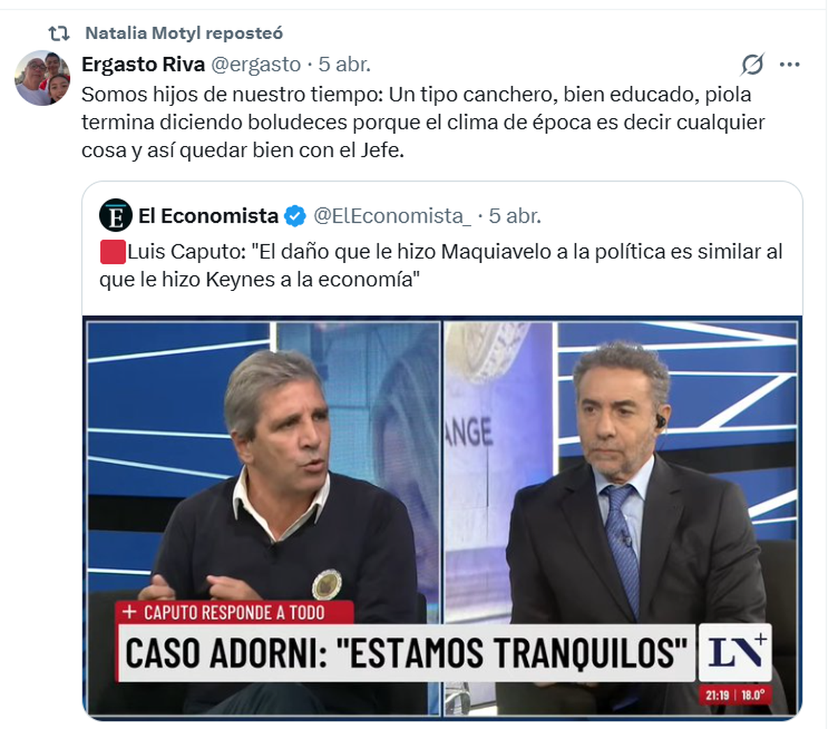 En este contexto, Luis Caputo salió a culpar a otros (el periodismo, el kirchnerismo, la Guerra en Irán, los economistas...) por la falta de buenas noticias. Toda una mileinización del ministro de Economía, quien incluso incurrió en exabruptos, como decir que "me dan ganas de cagarlos a patadas en el culo" , a quienes reclaman una devaluación del tipo de cambio para mejorar la competitividad.