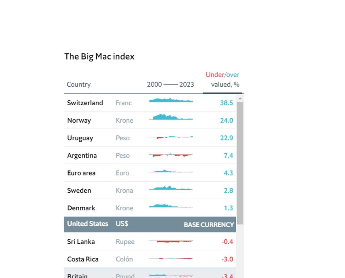 Otras de las monedas más sobrevaloradas son el franco suizo con 38,5%, la corona noruega con 24%, el euro con 4,3%, la corona suiza con 2,8% y la corona danesa con 1,3%.