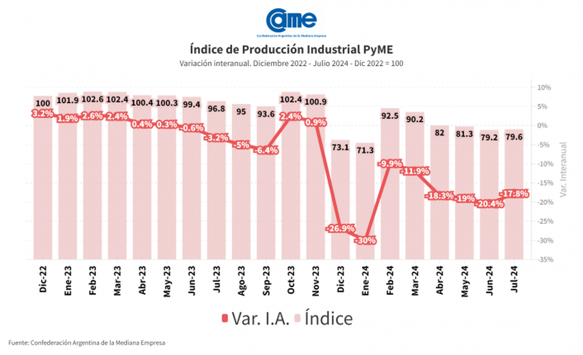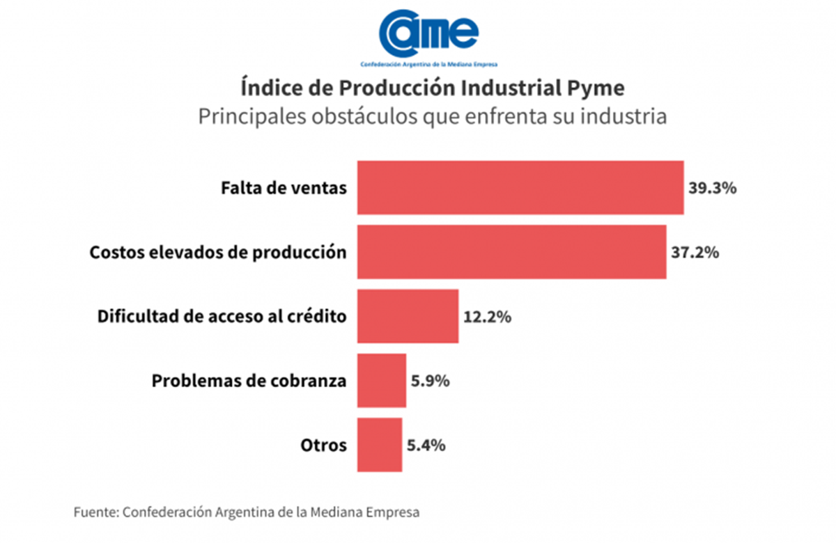 La industria Pyme trabajó en julio de 2024 con apenas el 60,6% de su capacidad instalada y casi el 20 % tuvo problemas para hacer frente al salario de sus trabajadores, según la Confederación Argentina de la Mediana Empresa, CAME.