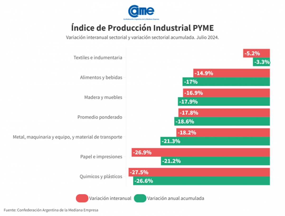 La actividad de la industria pyme acumuló fuerte retracción en los 7 meses del año 2024 frente a mismo período de 2023, de acuerdo a una encuesta de CAME.