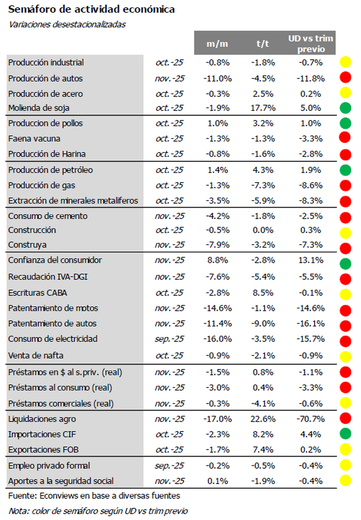 Del lado real, los números tampoco acompañan el optimismo oficial. La industria cayó 0,8% mensual en octubre y acumula retrocesos significativos en sectores clave desde noviembre de 2023. Textiles se hunden más de 37%, caucho y plásticos casi 24%, y los productos de metal superan el 20% de caída.