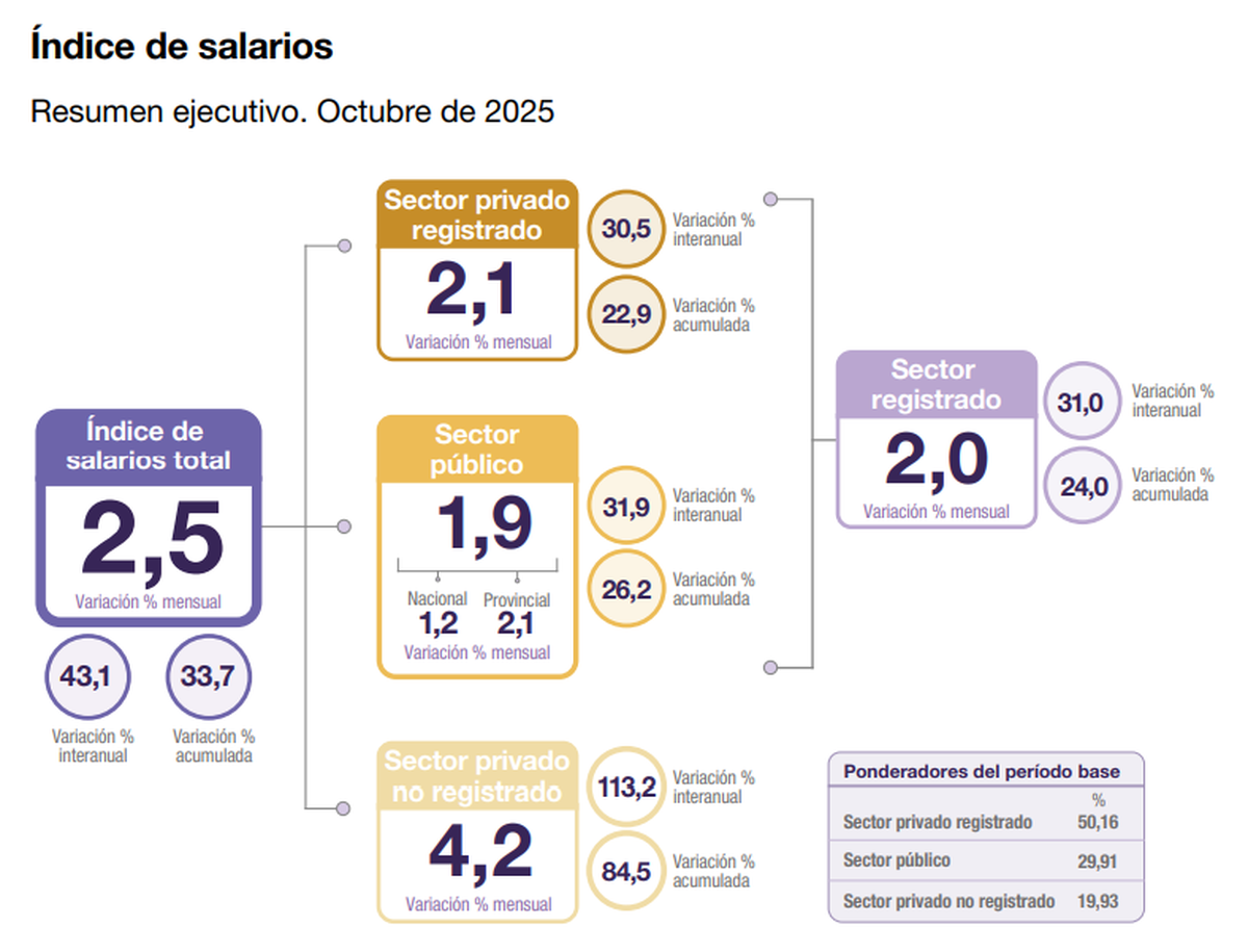 En paralelo, el Índice de Salarios avanzó 2,5% mensual, con un aumento 33,7% acumulado en 2025 y 43,1% interanual.