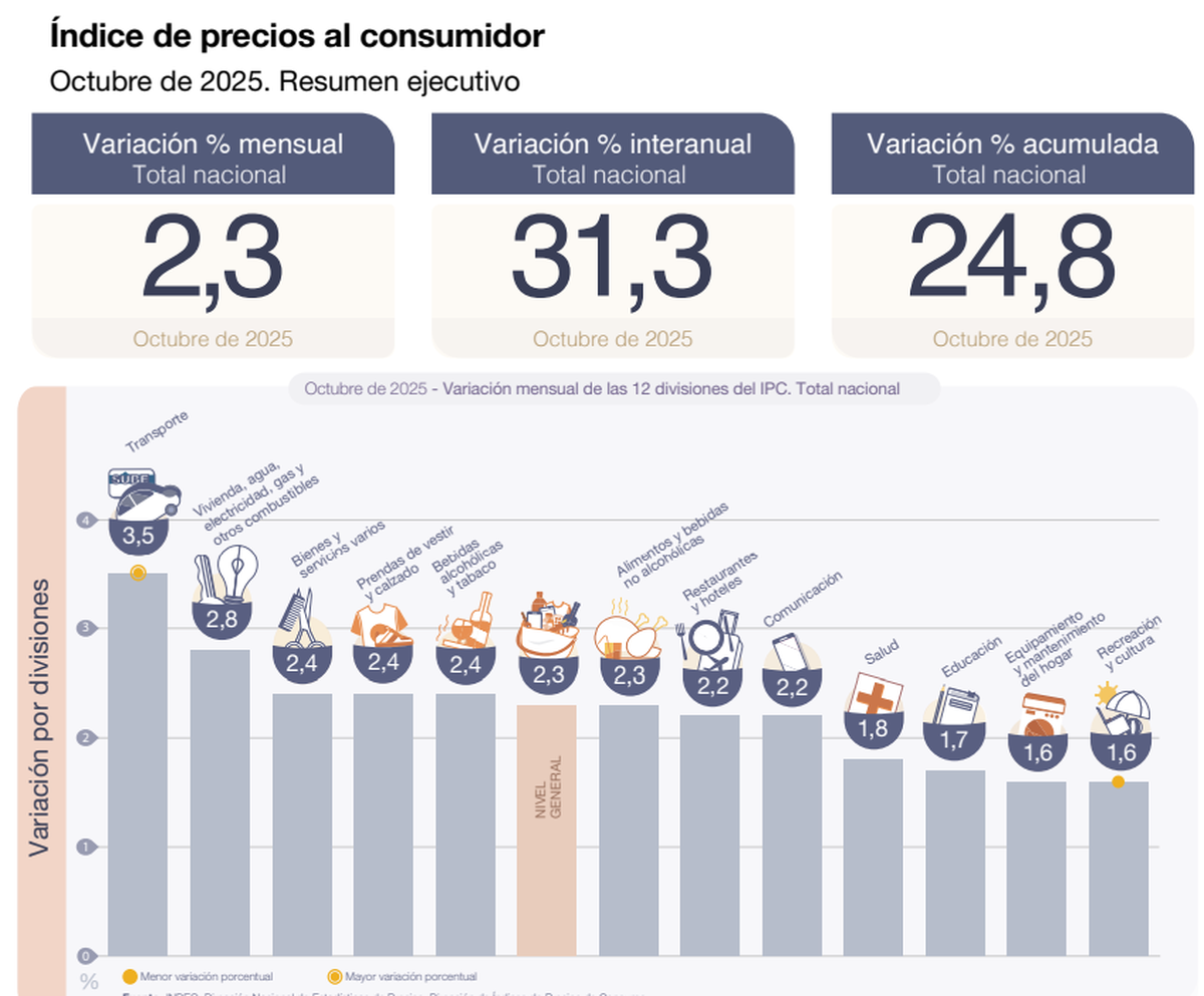 El IPC de octubre confirma que el proceso de desinflación continúa, aunque sin margen para el triunfalismo. El nivel general avanzó 2,3%, impulsado principalmente por Transporte (3,5%) y Vivienda, agua, electricidad y gas (2,8%), dos rubros altamente sensibles para los hogares y con fuerte incidencia regulatoria.