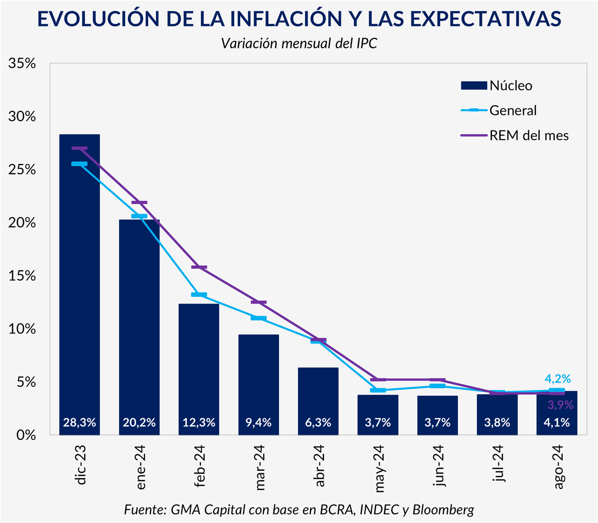 Esta semana el INdEC dio a conocer la Inflación de agosto y, para sorpresa de muchos, esta no logró romper el piso del 4% y terminó en 4,2%. Todo esto, la gente de GMA lo sabe bien, tal como destacan en su weekly titulado "El piso invisible de la inflación".