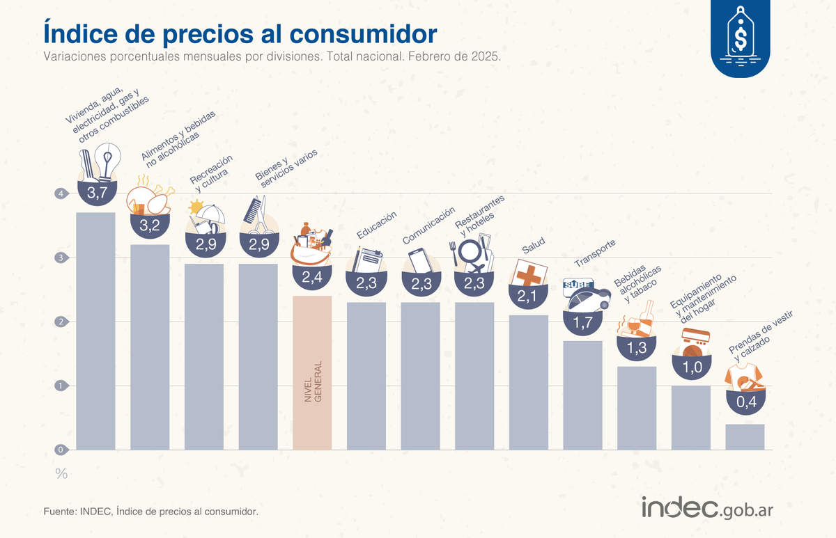 Los sectores con mayores aumentos fueron vivienda y servicios (3,7%), alimentos y bebidas (3,2%) y esparcimiento y cultura (2,9%). En el otro extremo, las menores subas se registraron en bebidas alcohólicas y tabaco (1,3%), electrodomésticos y equipamiento del hogar (1%) y indumentaria y calzado (0,4%).