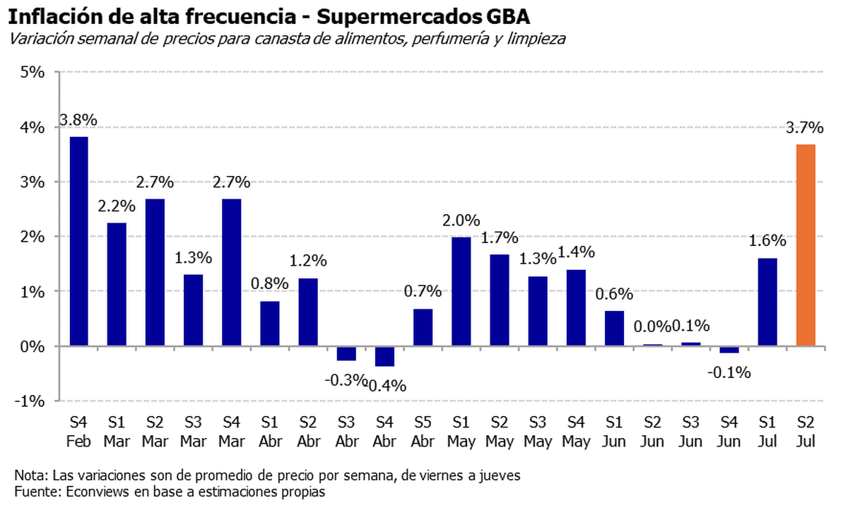 Varias consultoras ya relevan datos poco alentadores para el próximo IPC, una de ellas, Econviews, afirma: "Nuestro relevamiento de precios en supermercados arroja una suba del 3,7% en la 2da semana de julio para una canasta de alimentos, perfumería y limpieza."