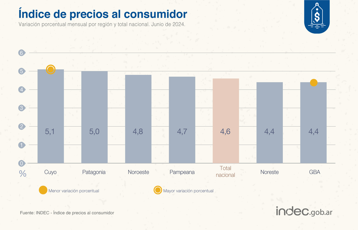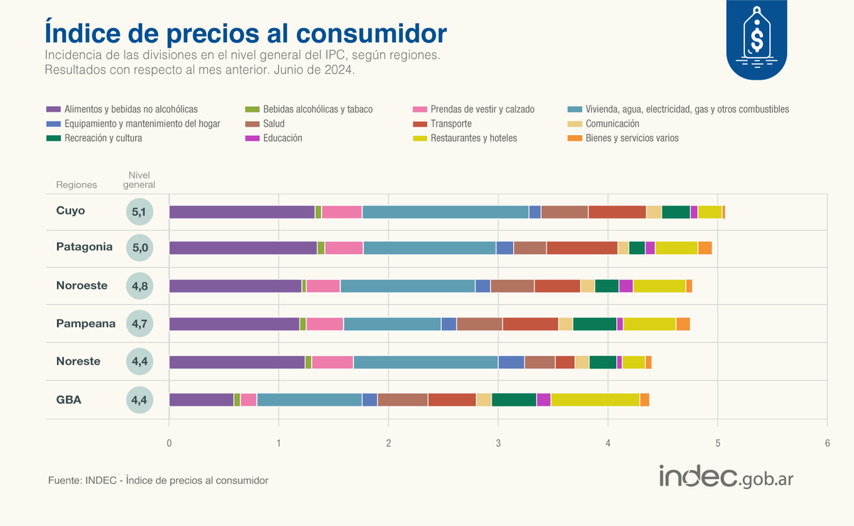 En junio de 2024, Vivienda, agua, electricidad, gas y otros combustibles aportó la mayor incidencia sobre la variación mensual en las regiones Gran Buenos Aires, Noreste, Noroeste y Cuyo; y Alimentos y bebidas no alcohólicas.